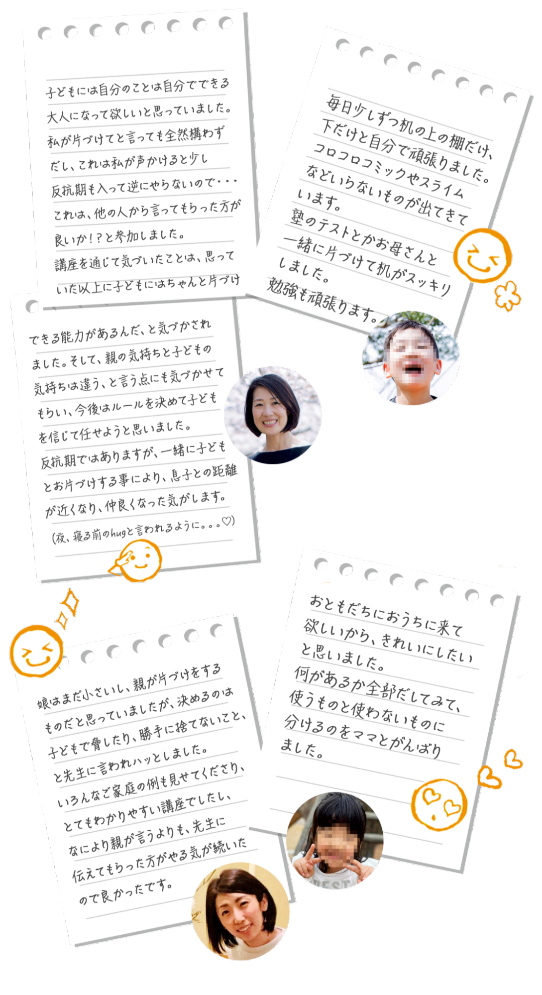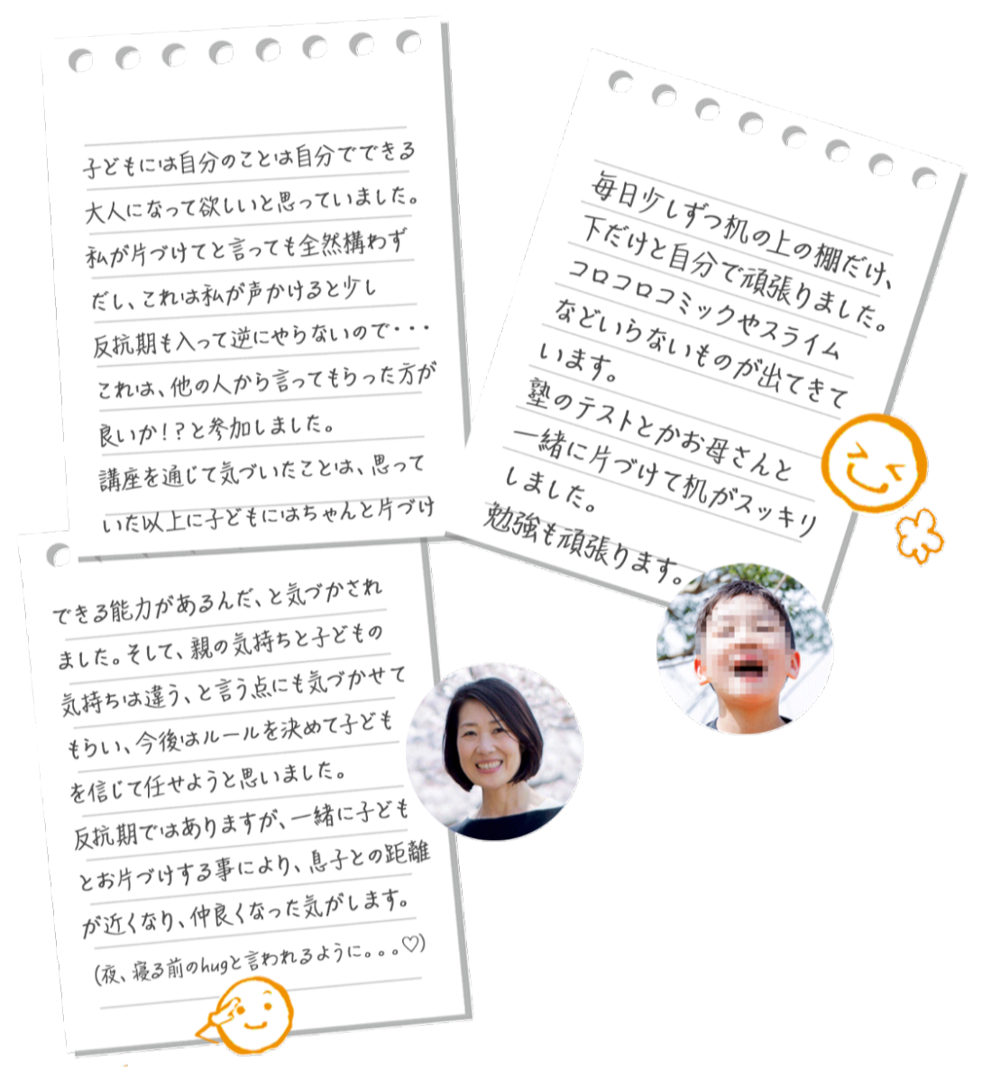 親子で片づけができるようになるだけではなく、コミュニケーション力アップのための内容を随所に盛り込んでいます。特に2回目の講座は「お子さんの自主性を育てるために親ができること」をテーマに実践できる内容を沢山お伝えしようと思っています。この夏休みで「片づけ」と「親子コミュニケーション」の悩みを卒業しましょう!