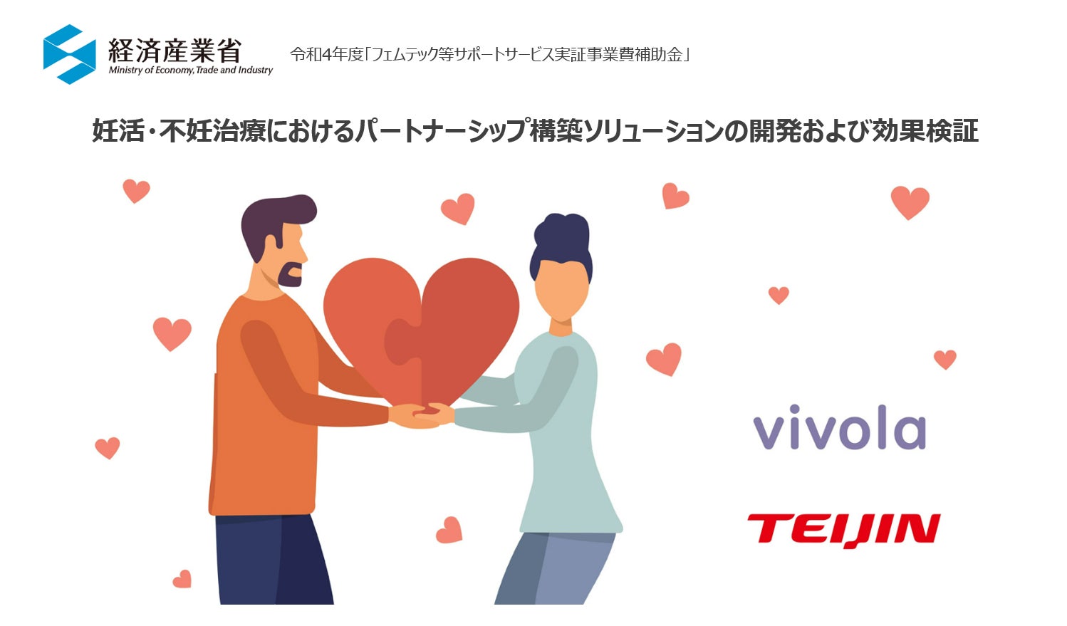 我々の調査によると、妊活や不妊治療をするカップルの多くが、男女のタイミングを取る事の難しさだけでなく、妊活や治療における方針や価値観の共有機会の欠落が要因でストレスを抱えていることがわかりました。そこで、帝人株式会社は、妊活中のカップル、vivola株式会社は不妊治療中のカップルを対象に、生殖リテラシー向上のサポート、価値観の共有、コミュニケーションの質と量の改善を促す、パートナーシップ構築サポートのサービスを開発しました。
