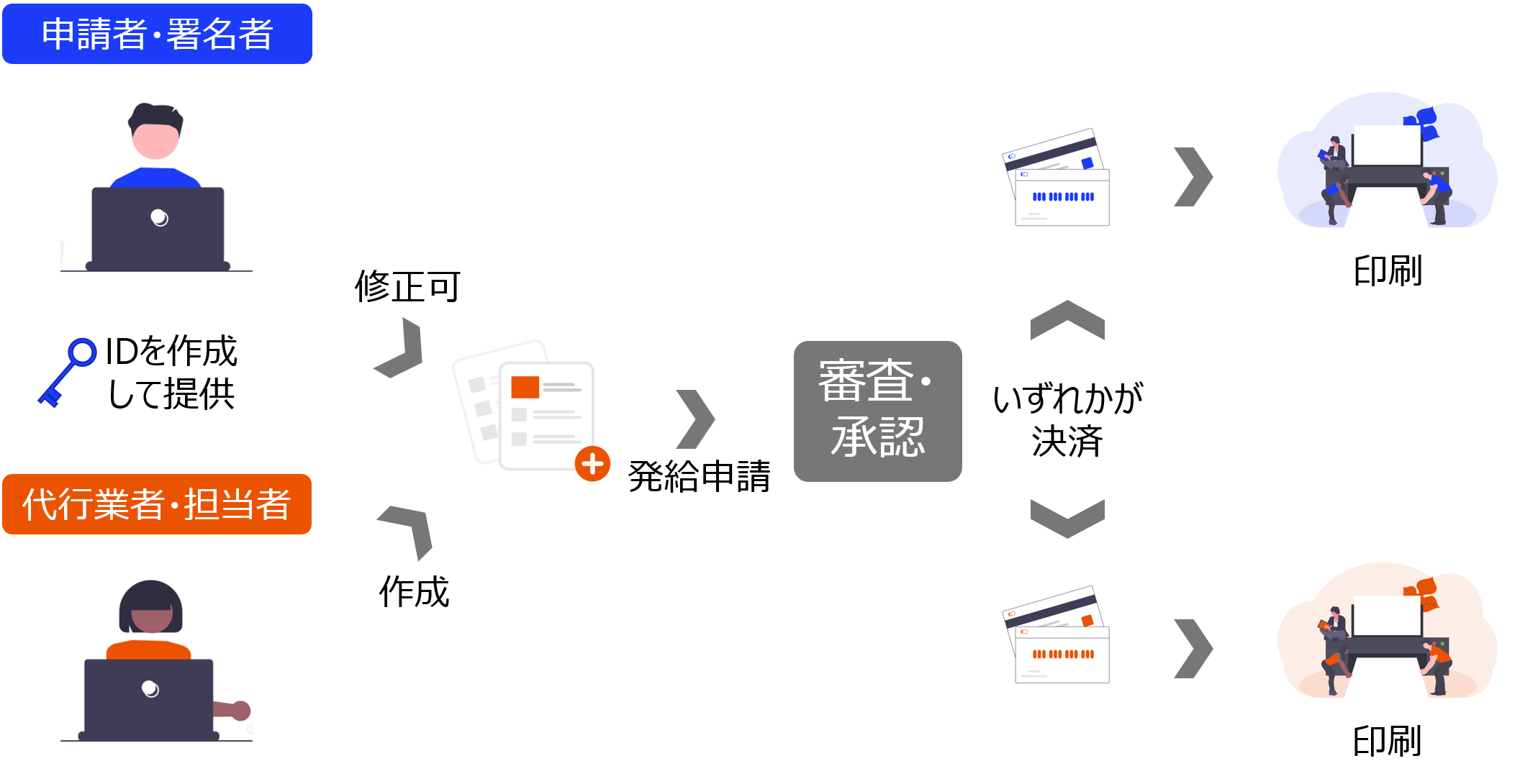 なお、証明の作成以外の操作(修正、発給申請、決済、印刷)については、申請者・署名者様からも行うことができます。