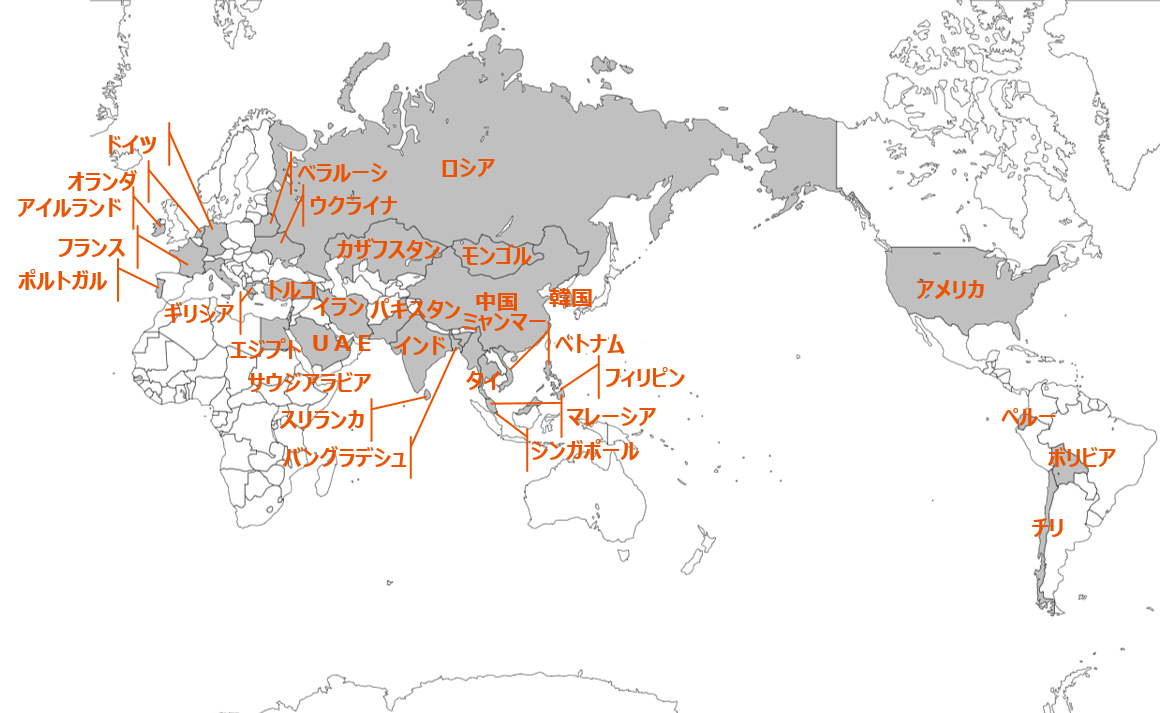 特定原産地証明を除く貿易関係証明の発給件数は、全国で年間約70万件に上ります。弊所では、このうち1/7にあたる約10万件を発給しています。1日あたり、300~500件の発給申請を受理し、クロスチェックでの審査を行い、即時発給を実現しています。また、オンライン発給については、1日あたり20件程度の発給申請があり、下図の通りアジアを中心に約40の国・地域に対して発給実績があります。
