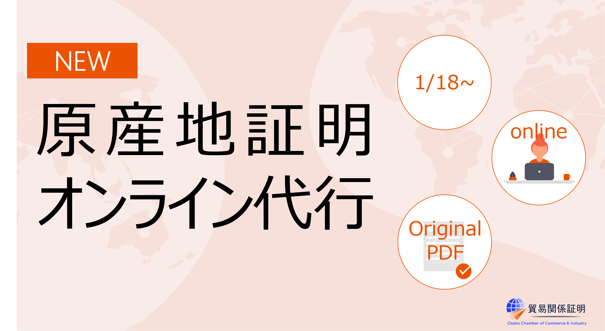 大阪商工会議所では、2022年1月18日より、日本原産地証明の作成や発給申請、決済、受領等を受託する企業(代行業者)様の貿易登録の受付を開始するとともに、貿易登録を有する代行業者様を対象に、オンラインでの日本原産地証明の作成・発給申請・決済・交付等のサービスを提供いたします。
