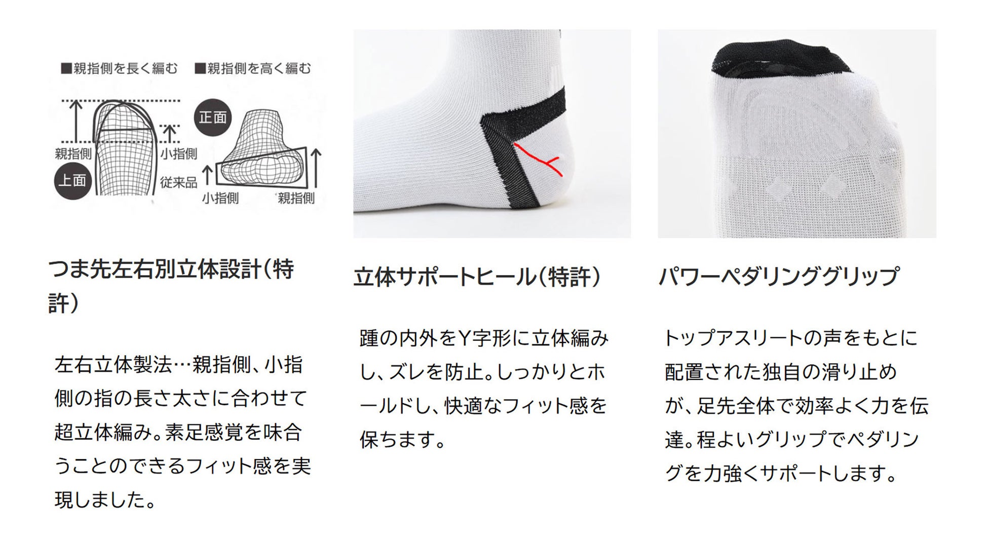 足とシューズの一体化を高める超立体製法により、長時間のライドでもズレにくく、快適なフィットを実現。ペダル操作に直結する繊細な足裏感覚を大切にし、グリップ性に優れたバイク専用の滑り止めも独自に開発しています。