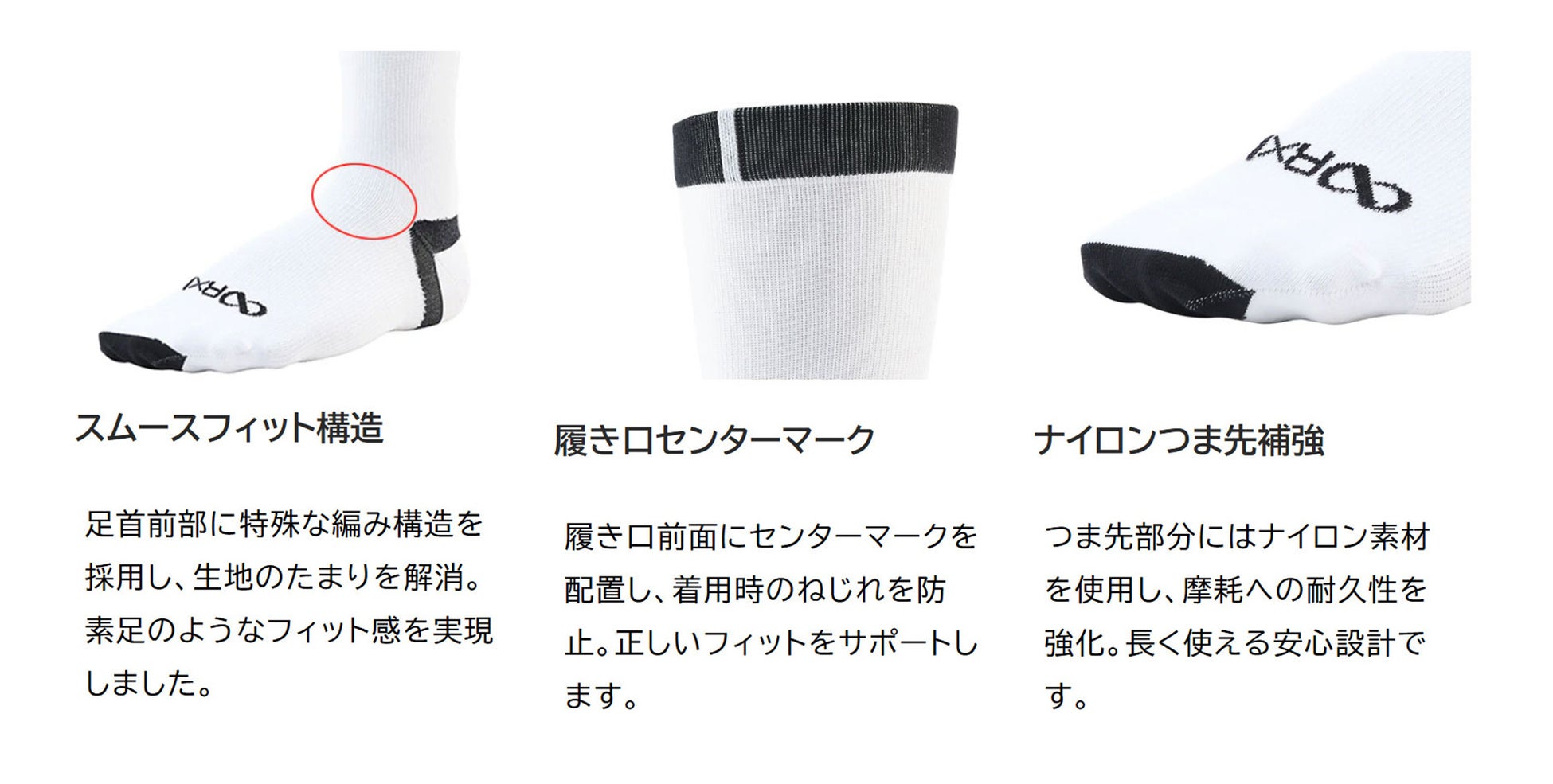 この二代目モデルでは、履き口のセンターマークを新たに追加して、より正確なフィット感を実現。また、環境にも配慮し、リサイクルポリエステルと天然素材の綿を組み合わせたサステナブルな素材を採用しています。