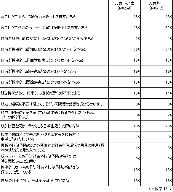 55歳~64歳、65歳以上の年齢別で健康に対する意識では記憶力の低下の自覚、筋力や柔軟性の自覚については双方、調査対象の半数がなにかしらの自覚症状を持っていた。65歳以上は55歳~64歳の年齢層のシニアに比べ「既に検査を受け、今のところ日常生活に支障はない」という項目では23%と5ポイント上回っている。65歳以上のシニアは、不安を感じたとき、すぐに検査を受けることで不安を解消し、日常生活への支障を取り除く動きを64歳未満のシニアに比べ能動的に行動している。今回の調査では、先に挙げた健康長寿国としての要因にプラスし「健康意識の高まり」も影響していることが見てとれる結果となった。
