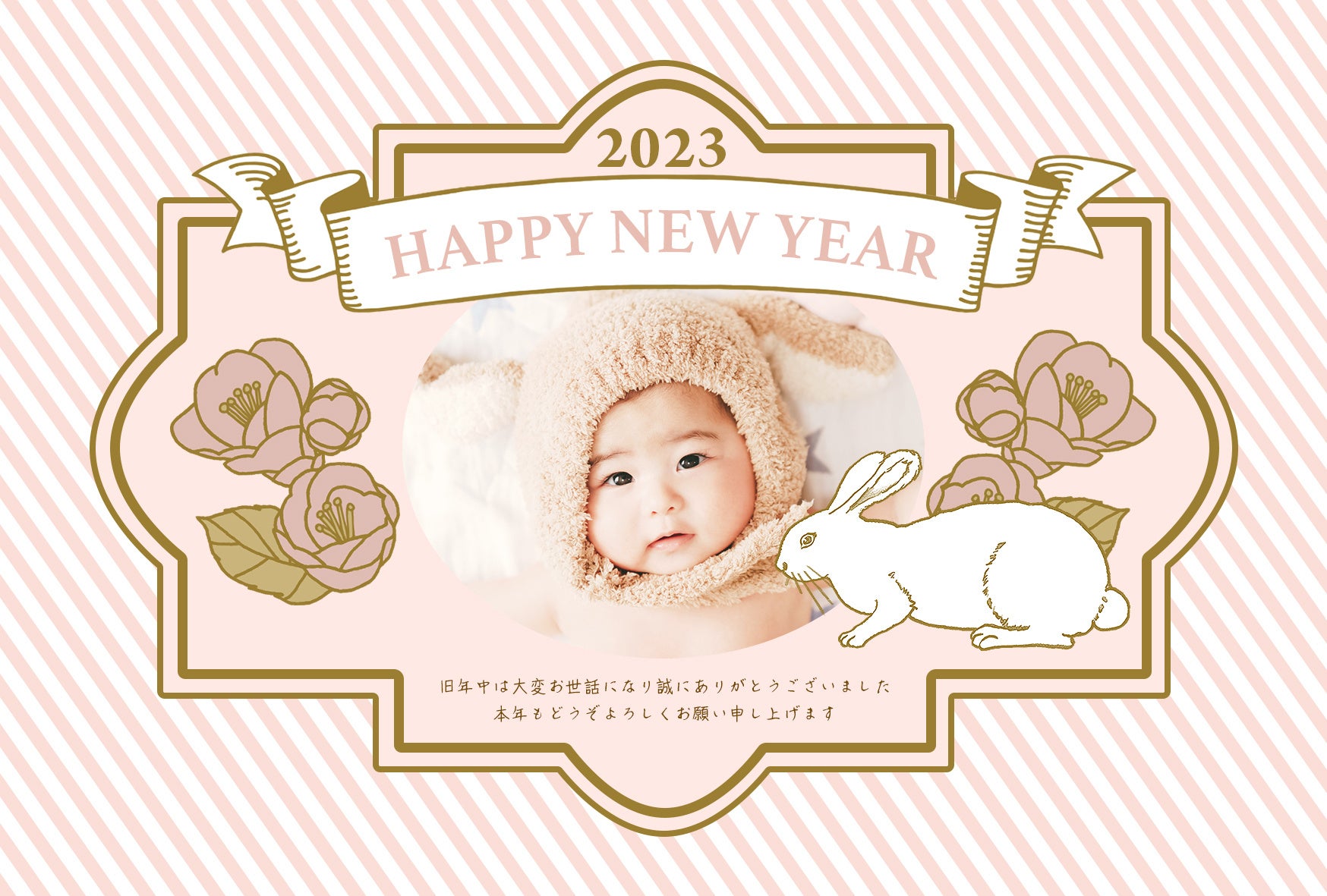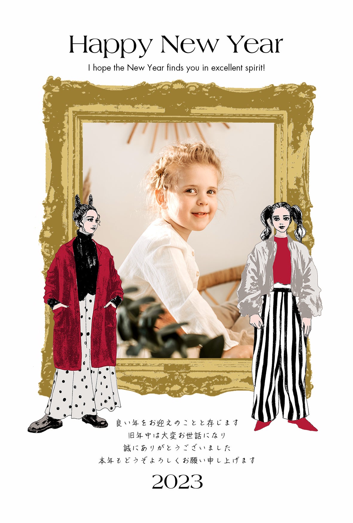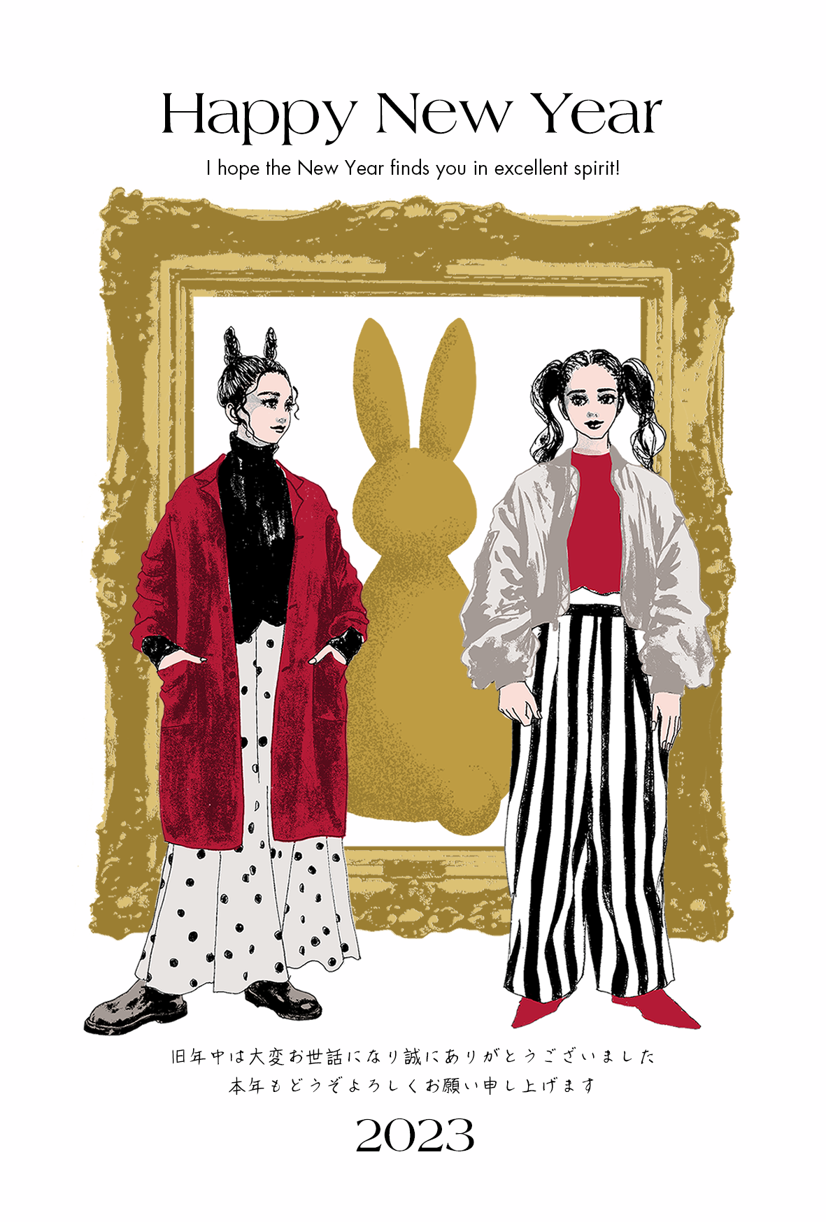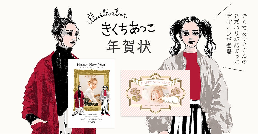 「スマホで年賀状 2023」と、インスタグラムでも27万人のフォロワーを誇る人気イラストレーター「きくちあつこ」さんのコラボデザインが登場。きくちあつこさんらしいファッションイラストテイストのデザインと、数ある干支のなかでも人気の「卯」年にちなんだ、うさぎのデザインの2種を描きおろしいただきました。