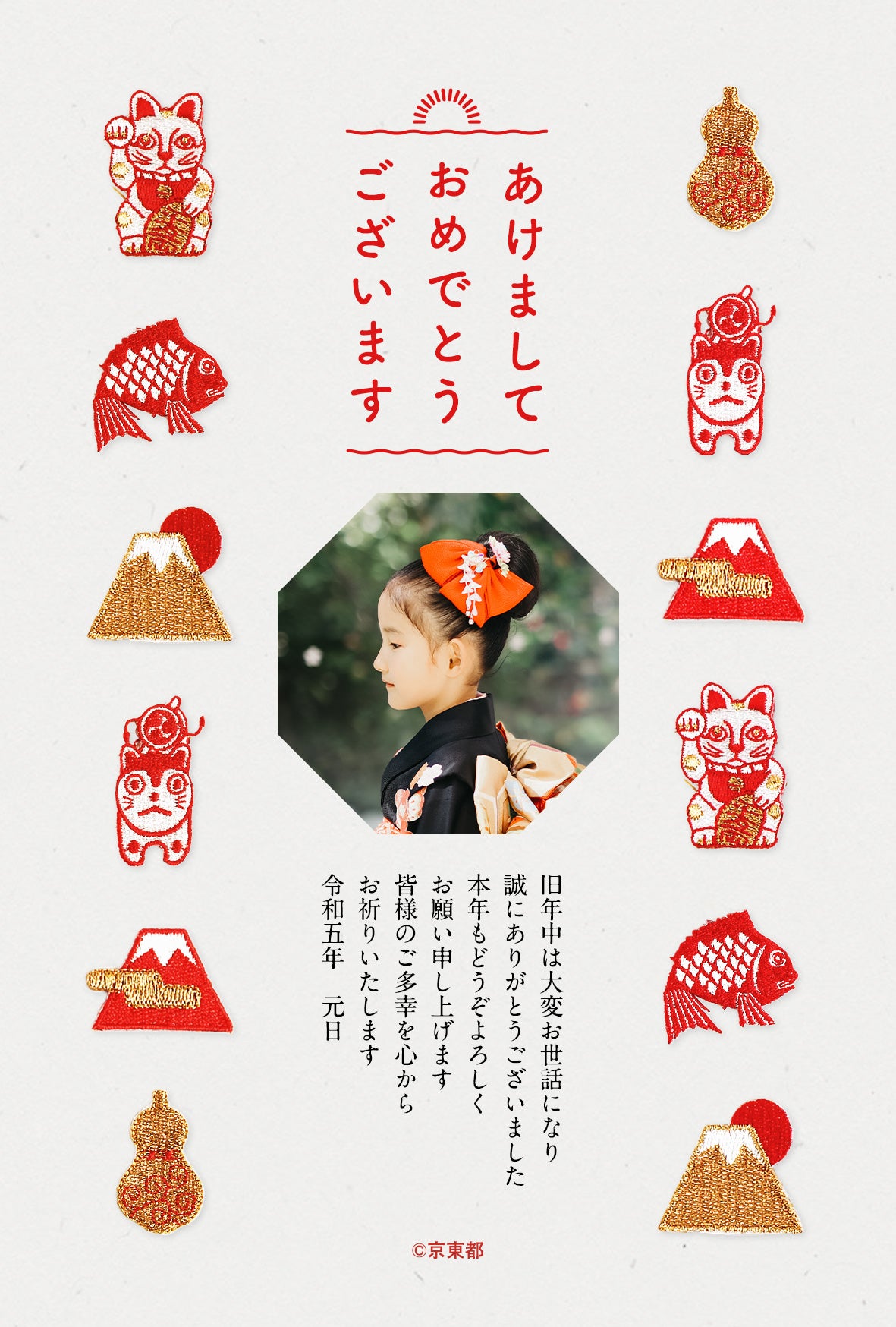 新しい文化継承のかたち・刺繍の可能性を考えるブランド「京東都(きょうとうと)」から、「和片(ワッペン)」をモチーフとしたデザインを中心に、新年のご挨拶にぴったりな和テイストの年賀状デザインが登場します。干支の卯にちなんだ新作の刺繍を用いたデザインや、年賀状との相性抜群の縁起物、また「京東都」のワッペンの中でも高い人気を誇る猫シリーズなど、ファンにもうれしい豊富なバリエーションとなっています。