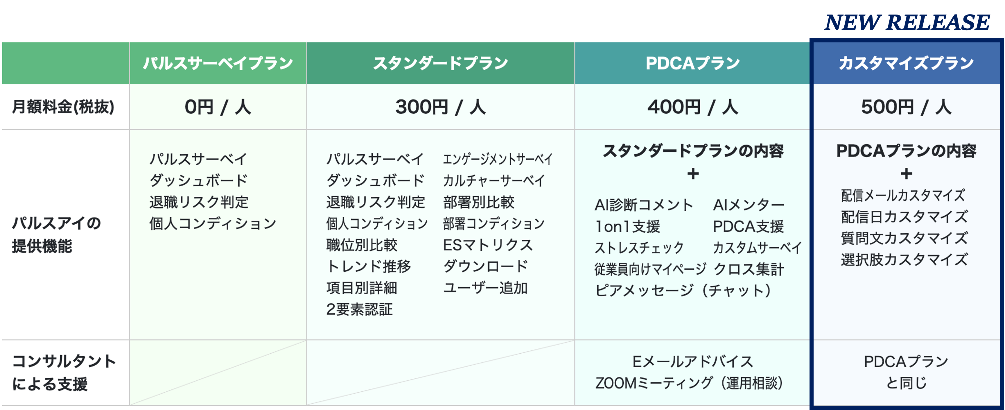 パルスアイは、ASPICクラウドアワード受賞に合わせて、アンケートの質問文や選択肢を自社独自の内容に変更できる新料金プラン「カスタマイズプラン」の提供を開始いたしました。カスタマイズプランでは、PDCAプランの機能に加えて、配信メール、配信日、質問文、選択肢のカスタマイズが可能で、月額料金500円(税抜)/人にてご利用いただけます。