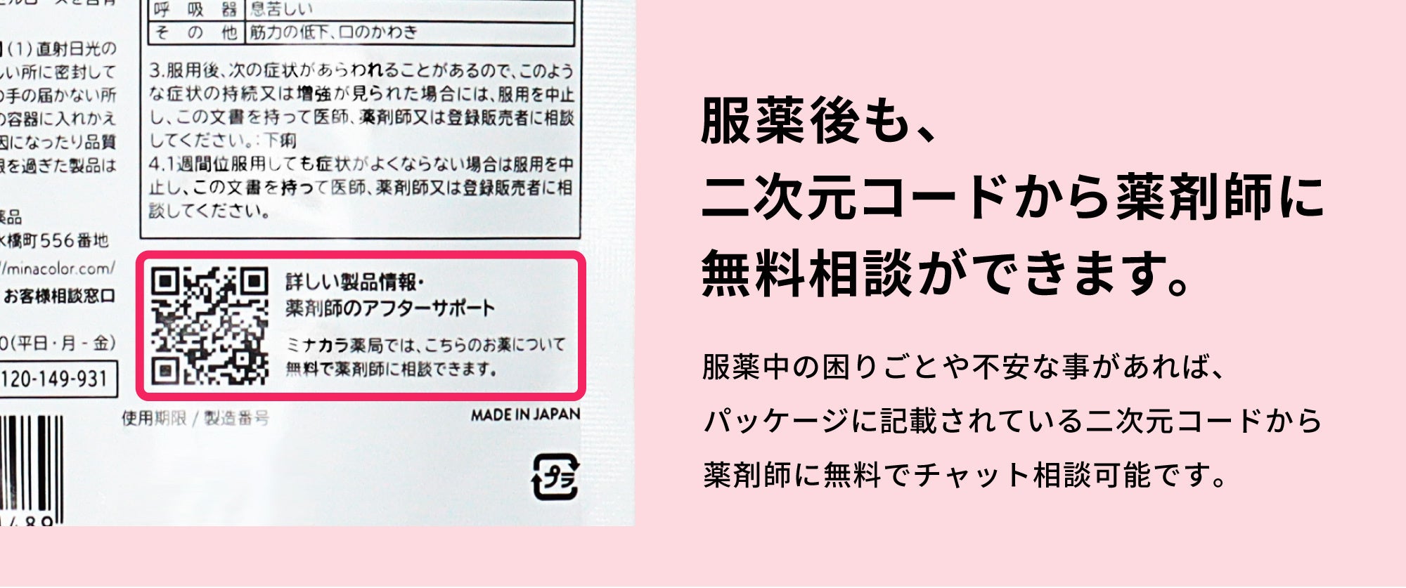 ミナカラでは、薬のインターネットでの販売はもちろんのこと、医療のプロである薬剤師等の知識や専門情報をベースに、お客様がご自分の症状にあった治療薬を知ることができるようお手伝いをし、また、購入後の服薬中の課題やお悩みのご相談をいただくところまで、一気通貫でサポートをしています。
