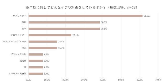 61.5%がサプリメントによる更年期ケアを行っている。ホルモン補充療法、薬は7.7%
