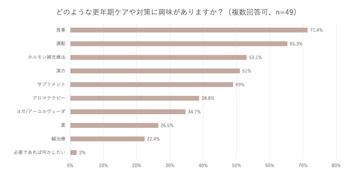 更年期に対するケアとして53.1%がホルモン補充療法に、26.5%が薬に興味がある