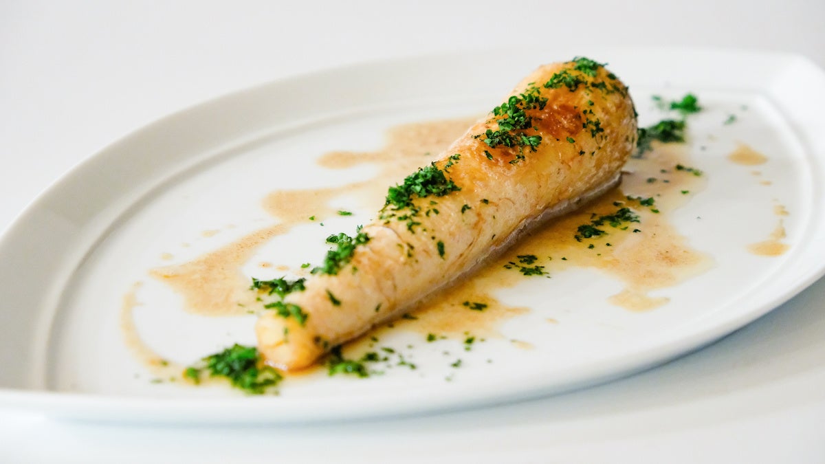 オーブンを使ってホクホクに焼いた根パセリにバターとクミンを合わせてソテーし、仕上げにパセリの葉を振りかけます。