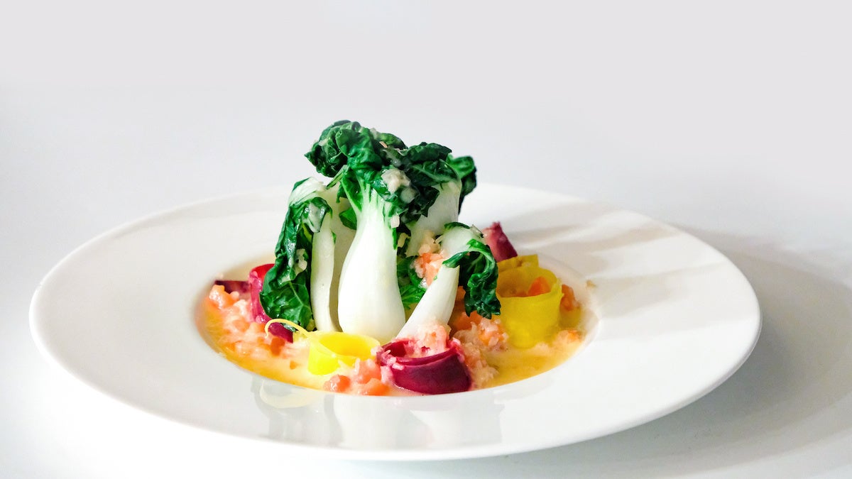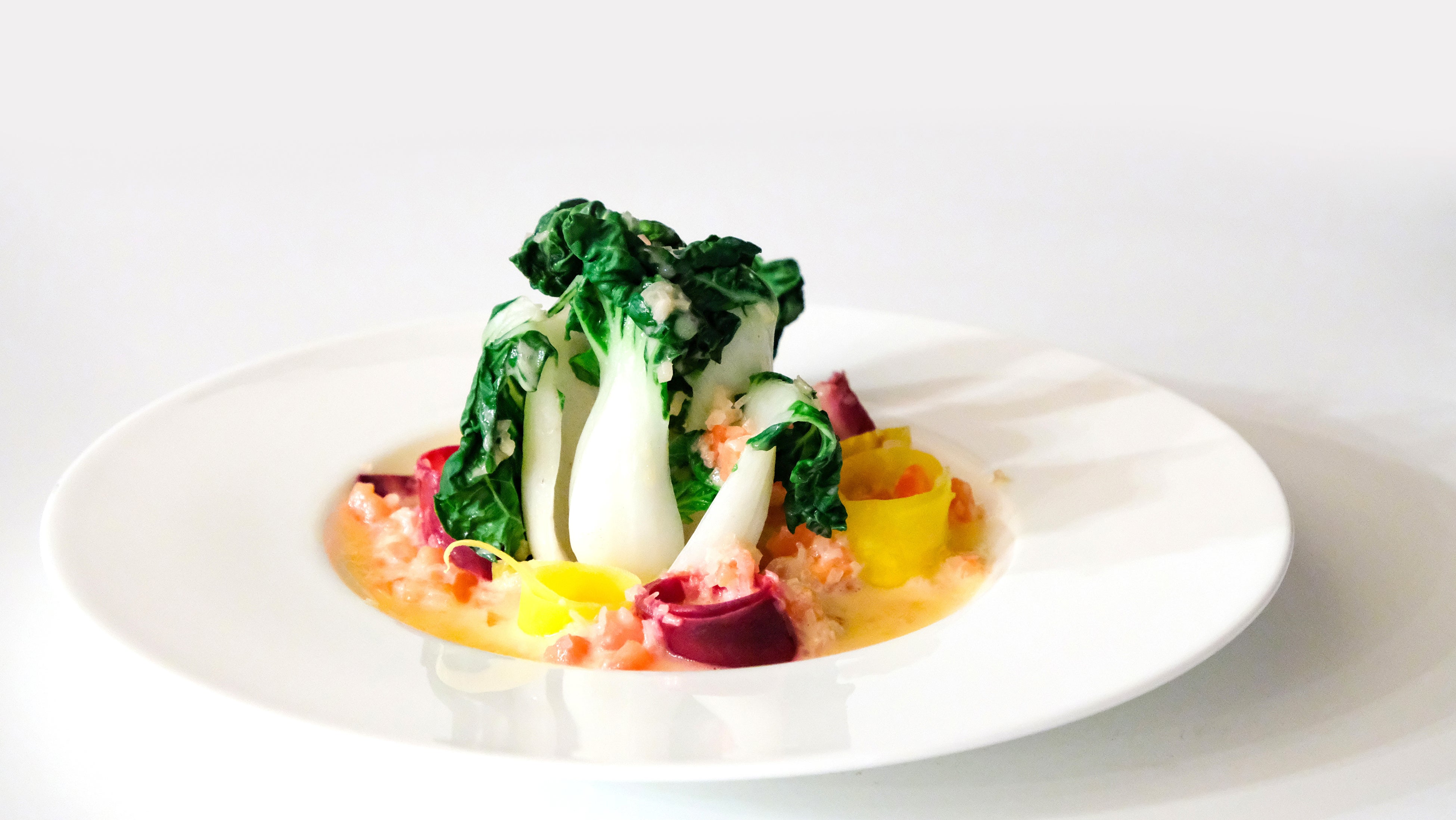 おいしく湯がいたミニ広東白菜と黄紫ニンジンに、エシャロットを使うフランスの伝統的なブールブランソースをかけた色鮮やかな一品。