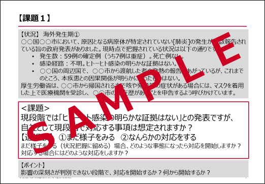 | 新型コロナウイルス感染症対応の振り返り | ●医療・危機管理専門家またはコンサルタントによる解説 ●訓練参加者とこれまでの対応を振り返り、課題を再確認 |