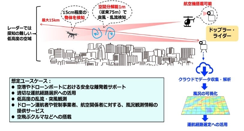 メトロウェザー株式会社(代表取締役社長:古本淳一、本社:京都府宇治市、以下「メトロウェザー」)は、ドローンや空飛ぶクルマが安全・安心に運航・離発着するための必須情報である突風や乱気流をリアルタイムに可視化する3次元風計測装置「ドップラー・ライダー」(注1)の開発・製造を行っております。この度、国立研究開発法人新エネルギー・産業技術総合開発機構(NEDO)の経済安全保障重要技術育成プログラム「航空安全等に資する小型無人機の飛行経路の風況観測技術」において、メトロウェザーが提案した「風況観測用ドップラー・ライダーの超多チャンネル化及び超高分解能化開発と飛翔体搭載型システムの実用化」が採択されました。