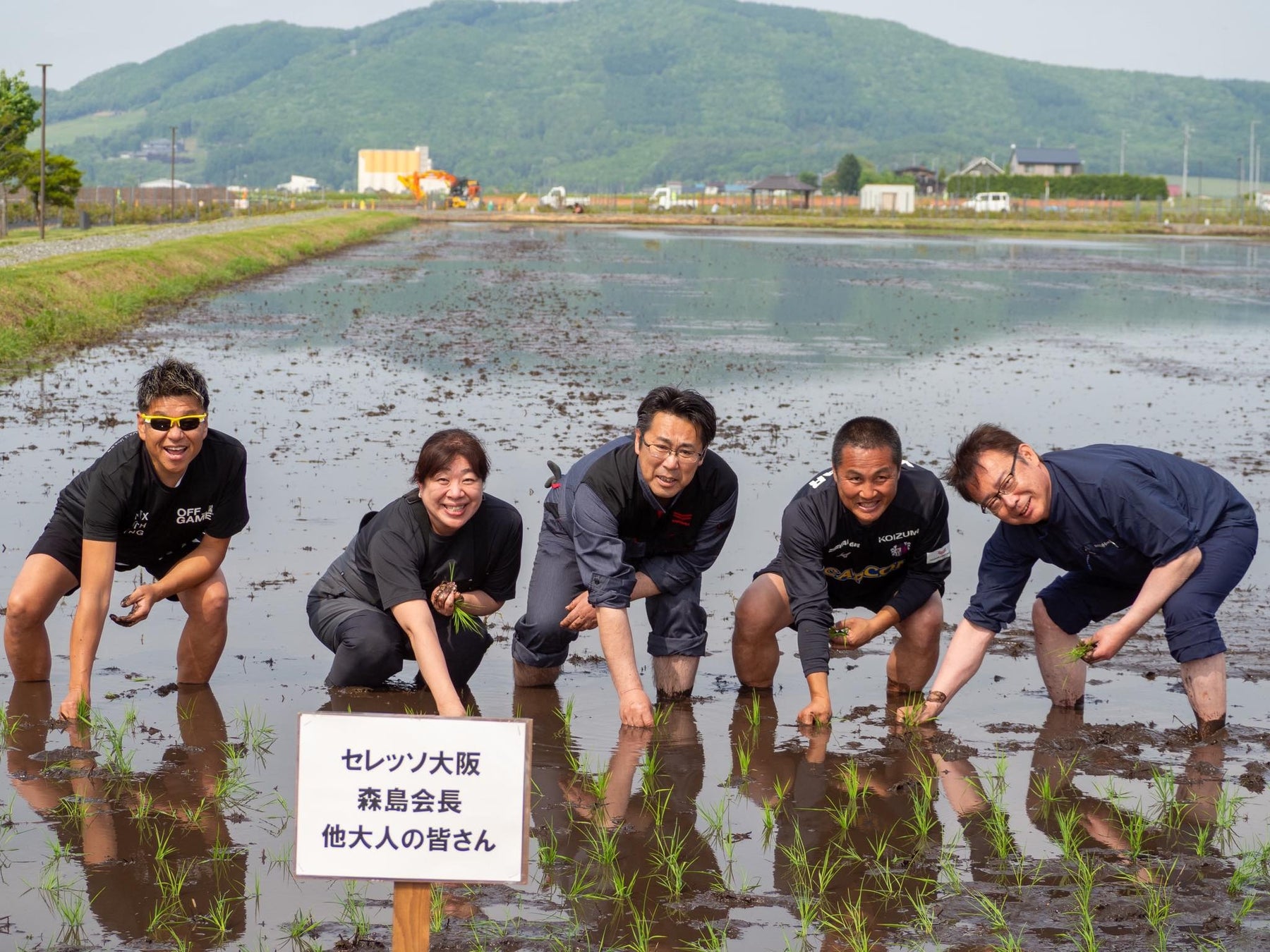 同日31日午後には、東川ゆめ公園体験農園にて田植えイベントを開催。セレッソ大阪の母体は「ヤンマーディーゼルサッカー部」であり、現在も農業機器メーカーのヤンマーはセレッソ大阪の「トップパートナー」でもあります。チームが農業と深い関係にあることから、東川町の基幹産業である稲作を体験してもらう取り組みとして実施されました。