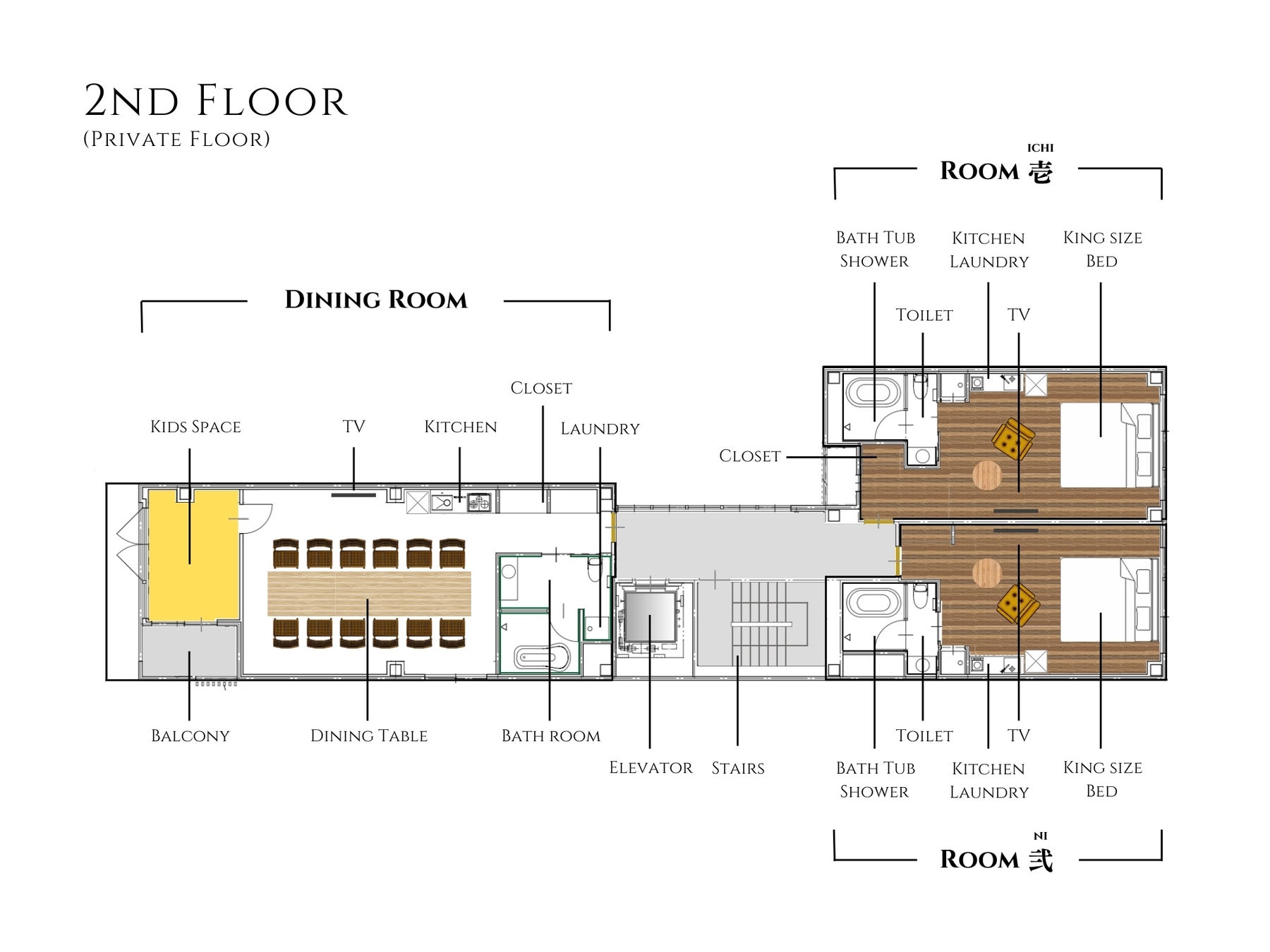 2階は、約70㎡の広大なダイニングルームと2室の客室、バスルーム、フルキッチン、ランドリー等を完備。