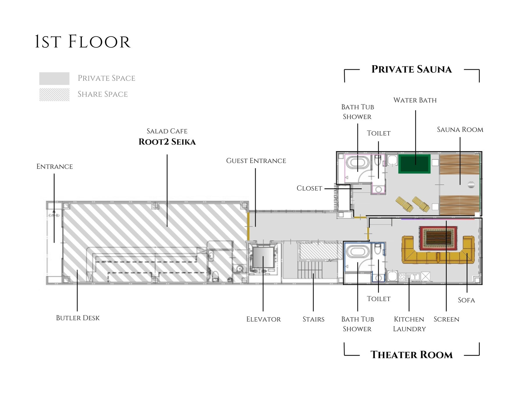 1階は、サラダカフェの奥にエントランス、プライベートサウナとシアタールームを完備。