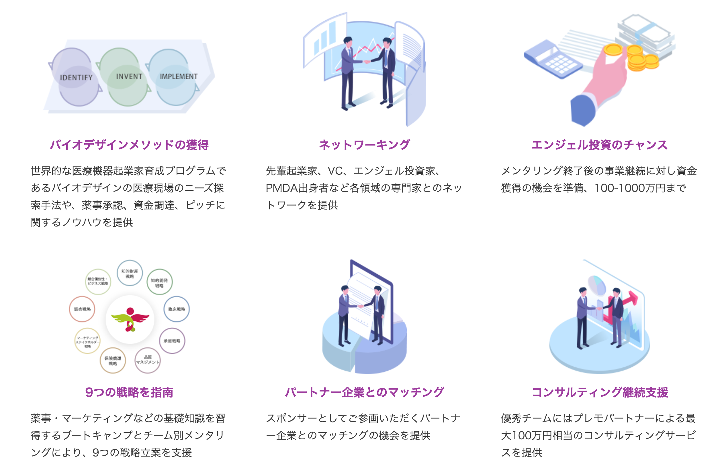 本イベントは、医療テクノロジー領域においてイノベーションを志す起業家に向けた国内初のMedTech特化型のアクセラレーションプログラムです。MedTech Angelsでは医療テクノロジー開発に必須の、薬事・マーケティング・保険償還・資金調達方法、ピッチなど幅広い知識やノウハウを提供します。5ヶ月間の専門講義とメンタリングを経て、次のステージである資金調達が可能な事業戦略を策定できる支援させていただきます。