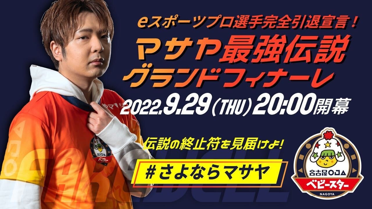 また、2022年9月29日20:00-24:00に #さよならマサヤ を合言葉に「#さよならマサヤ【eスポーツプロ選手完全引退宣言】マサヤ最強伝説グランドフィナーレ」YouTube配信を実施し、盛大に送り出します。