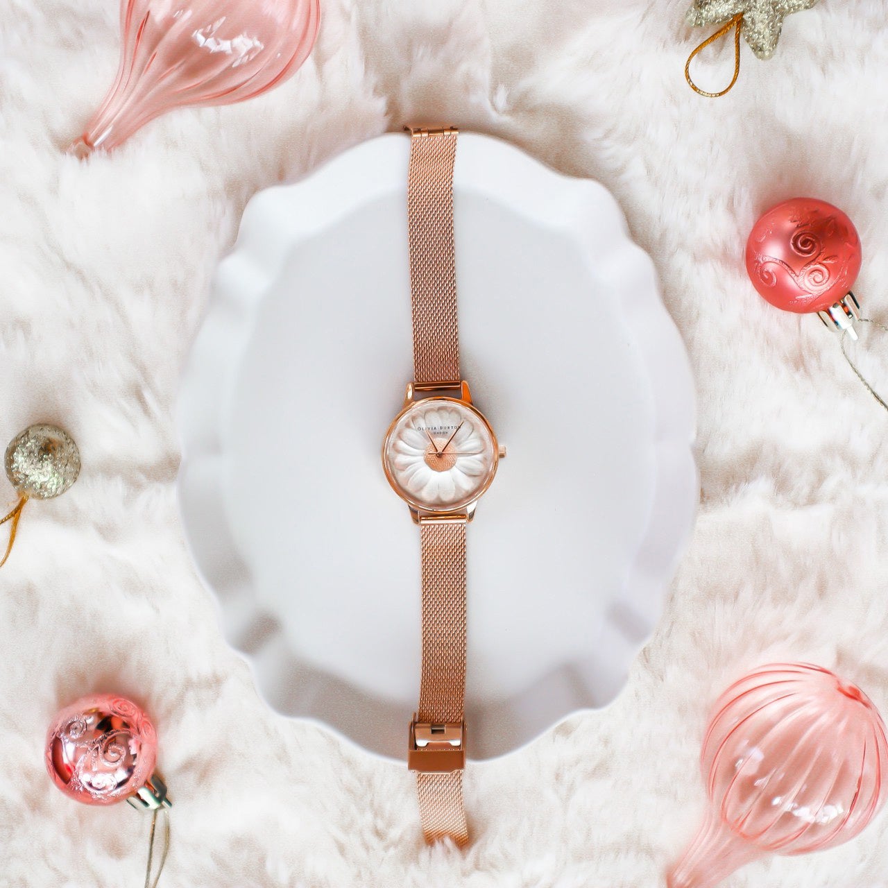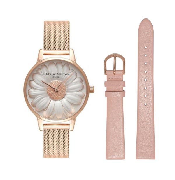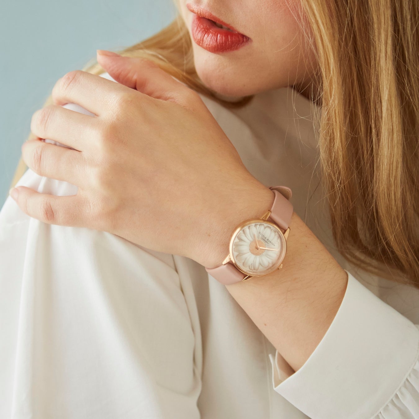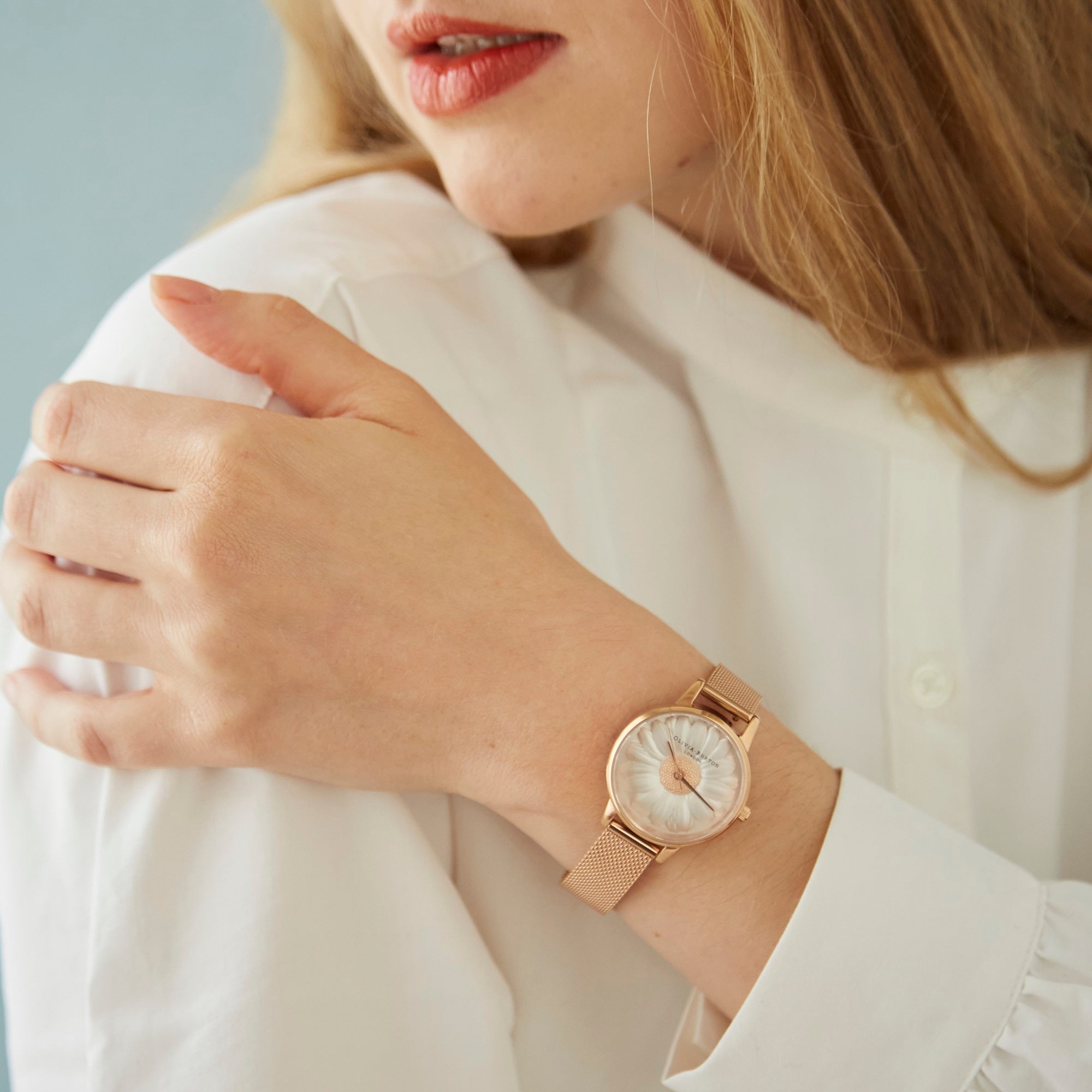 『3Dデイジー』は、文字盤いっぱいにデザインされた立体的なデイジーの花モチーフが特徴の腕時計で、数あるオリビア・バートンの中でも絶大な人気を誇るコレクション。今回のセットは、ローズゴールドのメッシュベルトと、くすみピンクのレザーベルトの替えベルトが付いた、karendo限定発売される特別カラーモデル。ベルトがシーンに合わせて付け替えが出来て、それぞれのベルトでワンランク上の大人っぽさを演出。華やかなパーティーシーンなどにも重宝いたします。