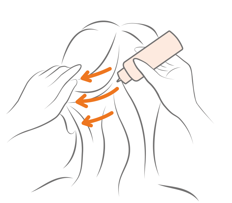 ノズルから直接、頭皮に塗ることができます。 後頭部は髪をかきあげ、横に線を引くように