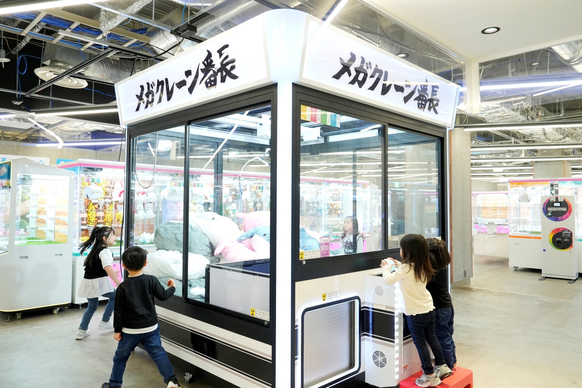 高さ2.5メートル、地域最大級の「メガクレーン番長」は、景品のぬいぐるみが小さく見えるほどの巨大クレーンゲーム。