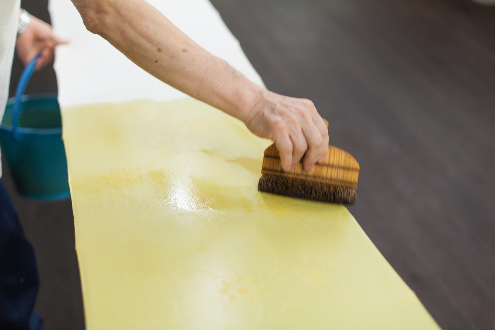 色無地は、絹に美しい色彩を表現するという、染織における重要な技術の粋とも言えます。千總のこだわりをもって、470周年にちなんで47の地色を選び、今や希少になってきた職人の手仕事で一枚一枚染めています。