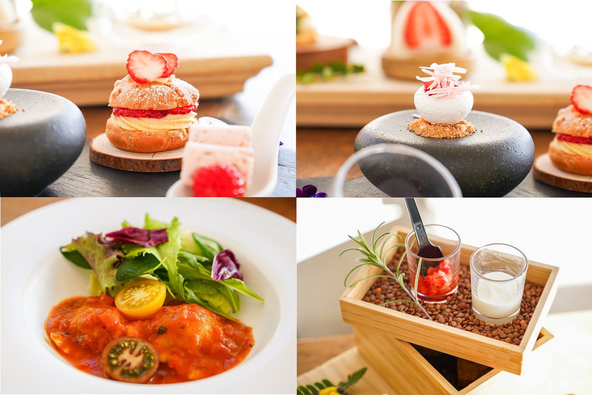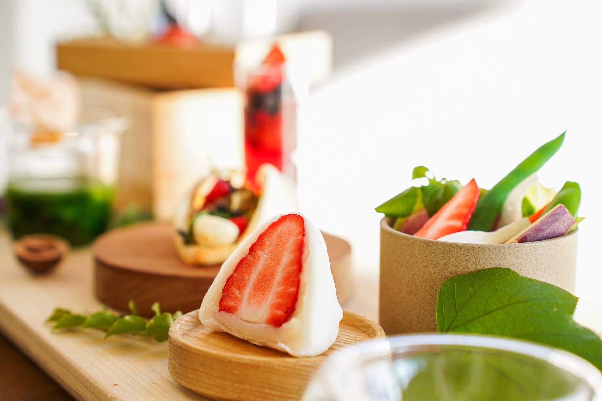 今回の主役は、伊豆の「ジュンサンベリーファーム」の新鮮ないちご。和菓子、スイーツ、セイボリーのそれぞれにいちごの魅力を閉じ込め、丁寧に仕立てました。