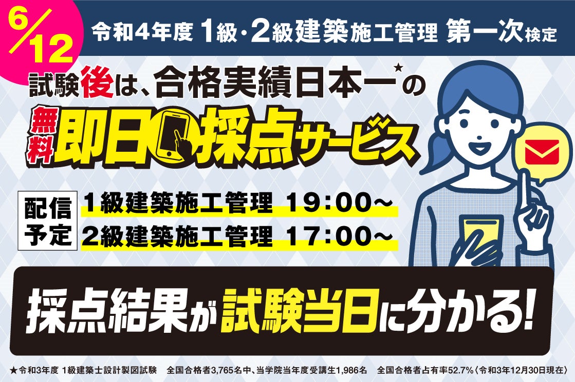 2022年度 1級・2級建築施工管理技術検定「無料・即日採点サービス」 1級19:00、2級17:00より採点結果配信!試験当日6/12(日)11:00~受付開始 【総合資格学院】