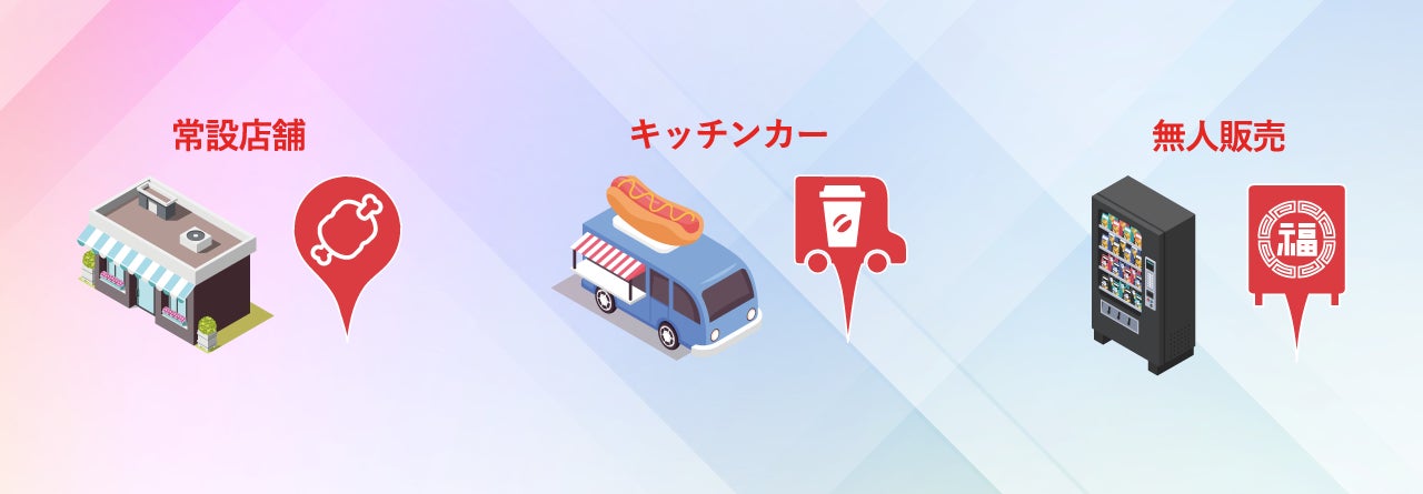 また、一般の店舗だけでなく、キッチンカーなどの移動販売店舗や、食品自販機・無人直売所などの無人販売店舗もご活用いただくことができます。
