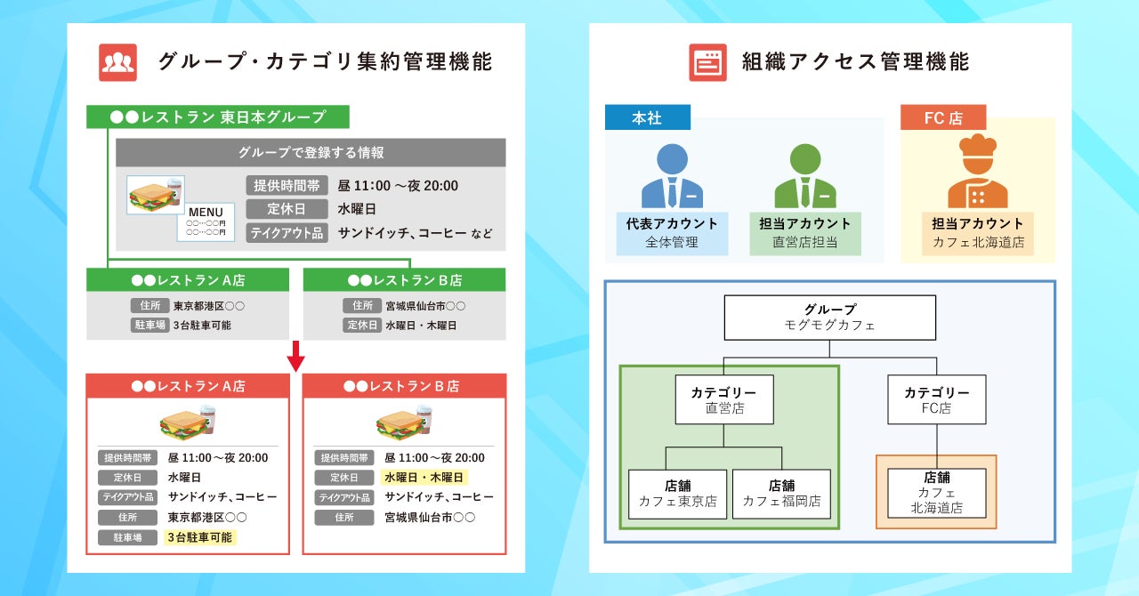 チェーン展開しており、同じメニューや営業時間などの店舗が複数ある場合でも、グループ登録しておけば、何度も同じ入力をせずに、一括で管理ができます。