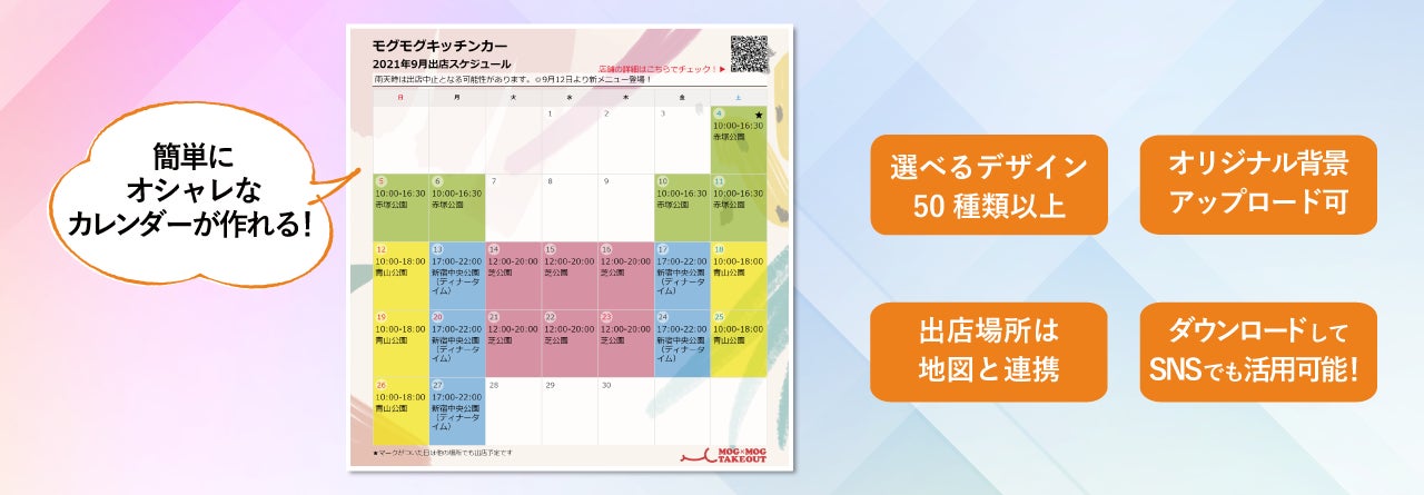 選べるカラーと背景でオリジナルの出店スケジュールを簡単に作成できます。