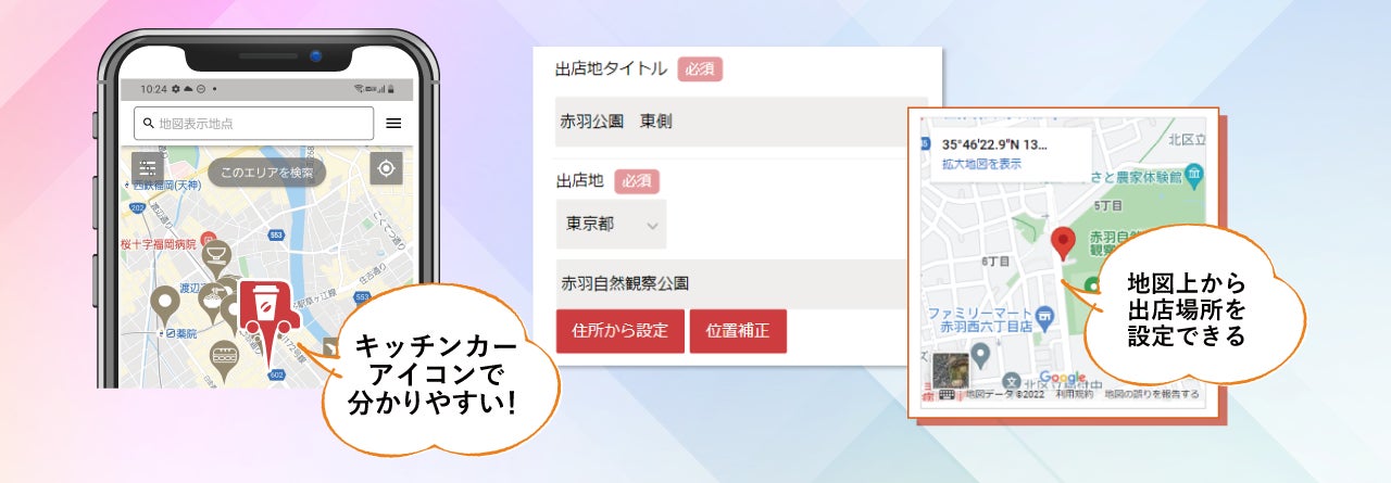 駅前や公園など、その場所の中でもどのあたりに出店しているのか、お客様に分かりやすく、マップ上で設定ができます。