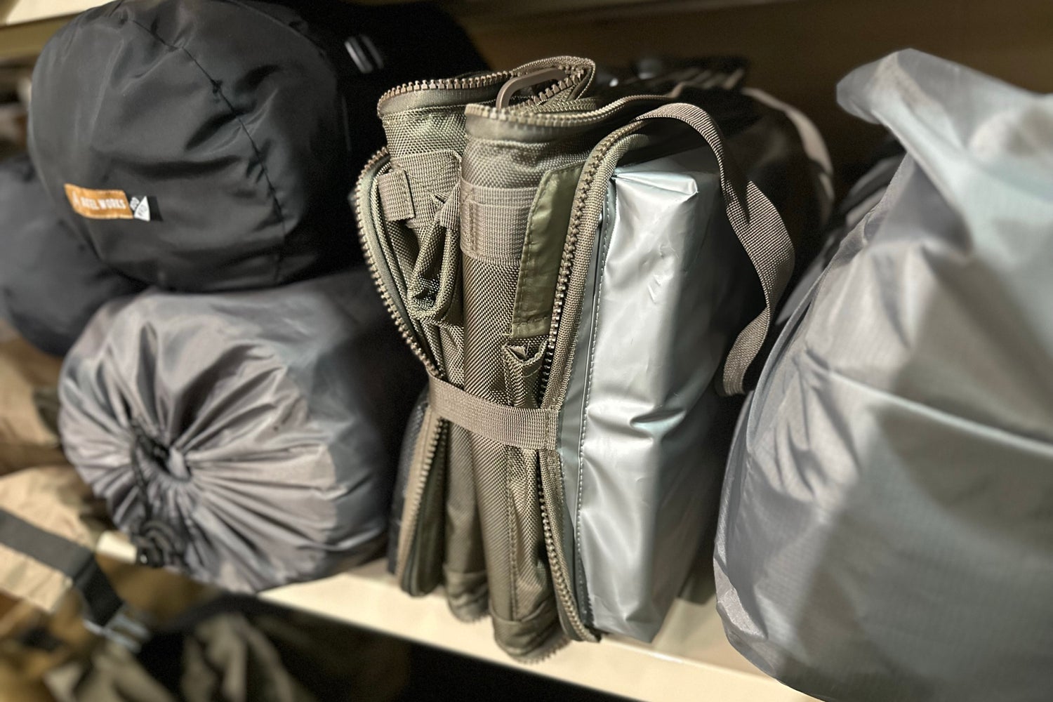 ショルダーストラップの位置を意図的にずらしており、折り畳みもスムーズ。また、畳んだあとにバックルでコンプレッション可能なので、嵩張らず、広がらないのが特徴。棚の隙間にもスッポリ入ります。