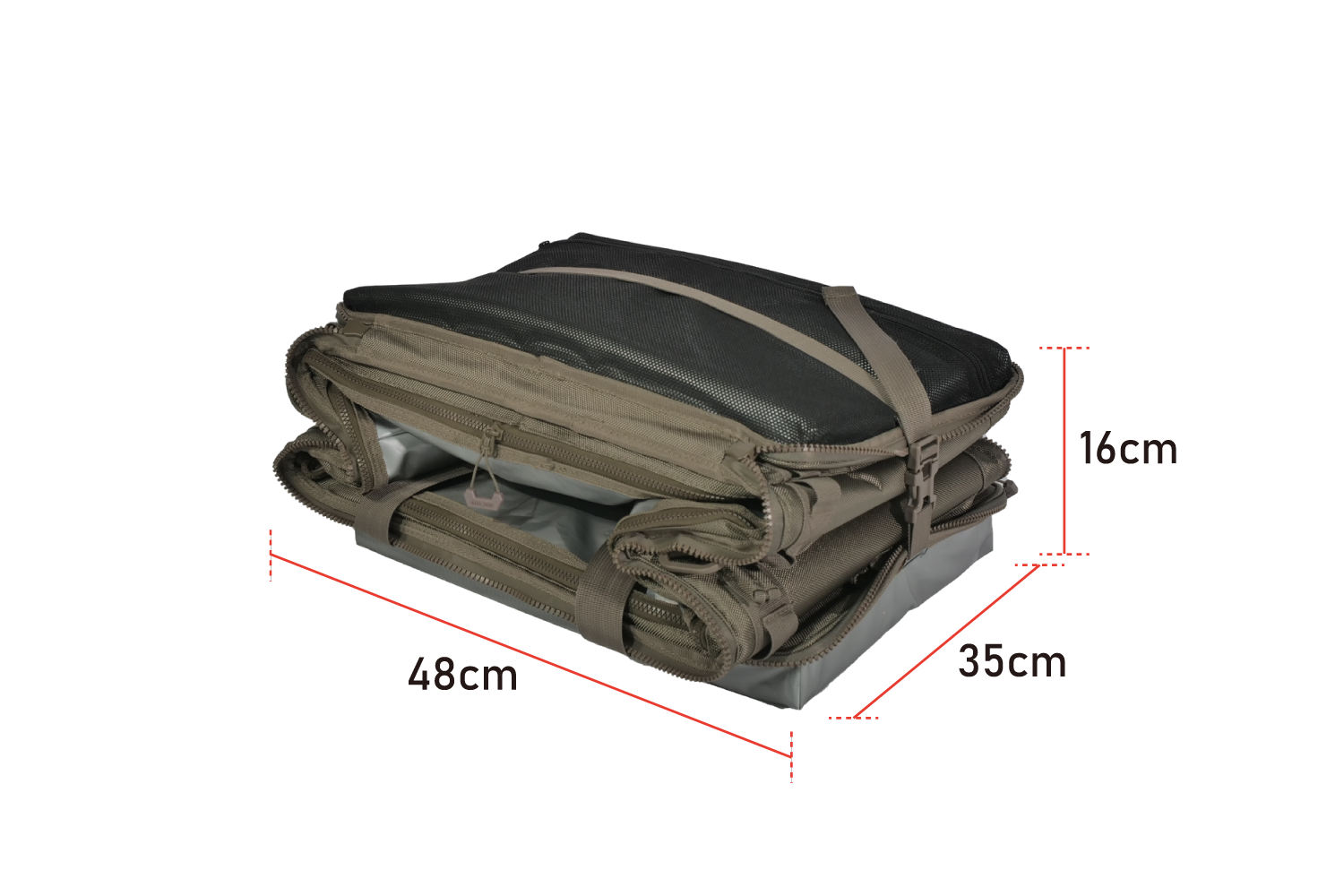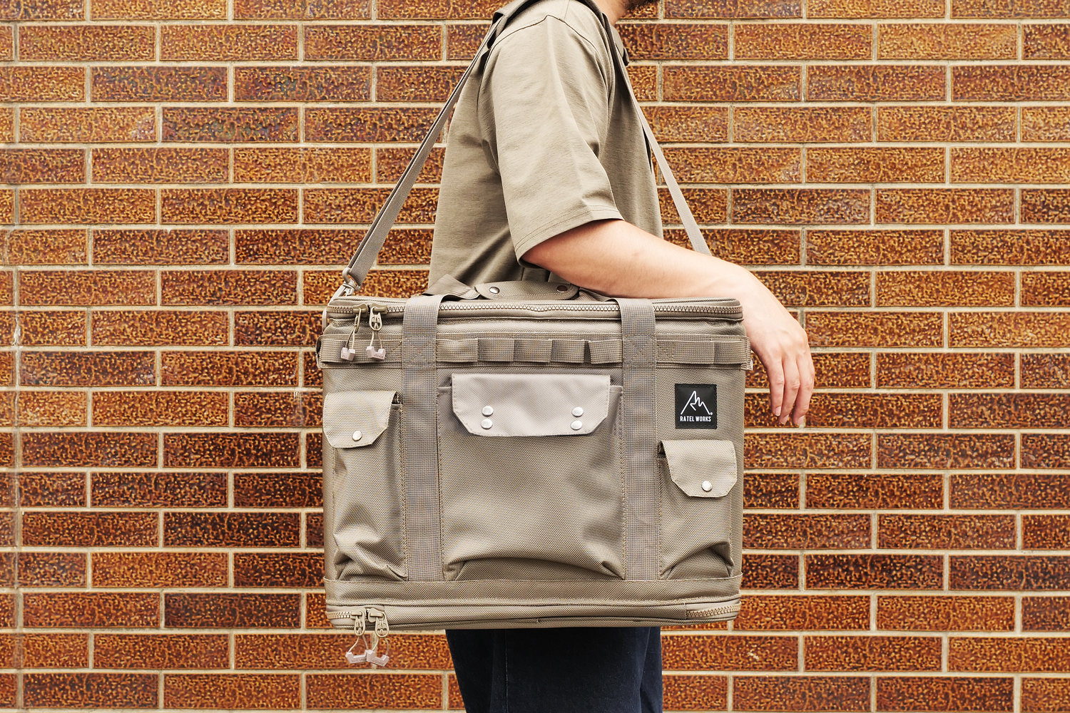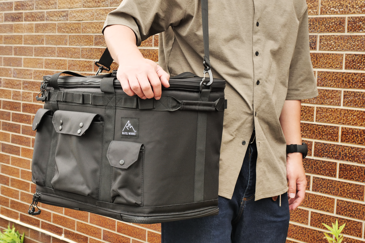 ショルダーストラップの取り付け位置は側面のポケット(マチなし)側に配置しいるので、ソフトクーラー本体が垂直に身体にくっつき、重くてもできる限り重さを感じにくい、人間工学に基づいた構造に仕上がっています。また、ストラップ取り付け位置を中心からずらすことで、収納時の折りたたみもベルトに干渉することなく、スッキリと折りたたむことが可能です。