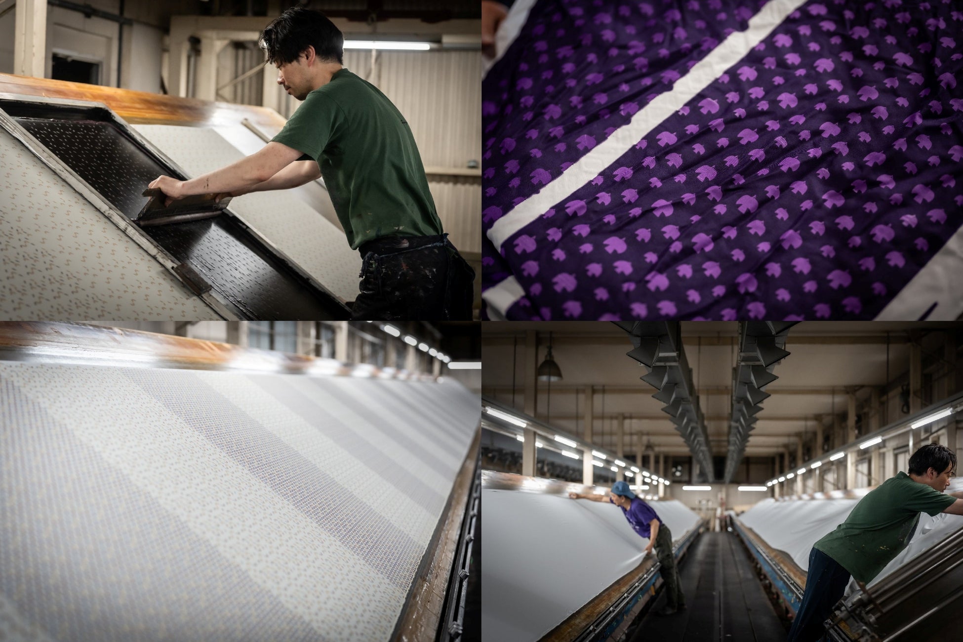 手捺染とは、型紙を使って布地に染料を刷り込んで染色する古くから引き継がれてきた伝統技法です。染料を注いで染める”注染染め”と比べて細かい模様や多色柄も染め上げることが出来ます。
