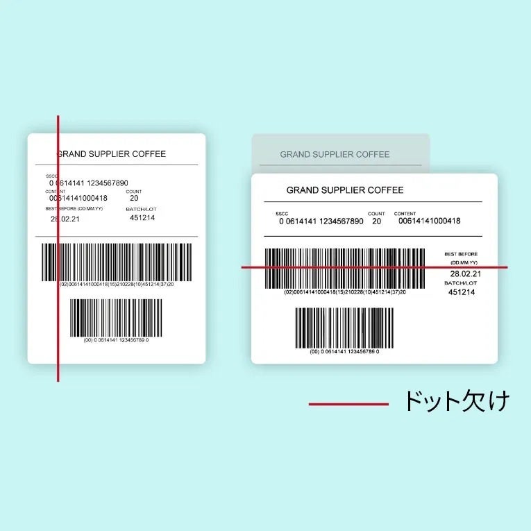 何かしらの要因で印刷したラベルに線状の空白ができてしまう「ドット欠け」が起きた場合、バーコードの機械可読性が失われる可能性があります。Videojet 9560PL に搭載されたスキャナでバーコードの読取不良が見つかった場合は、印刷内容のレイアウトを変えたラベルを自動で再貼付することができます。レイアウトを変えることでドット欠けの位置が変わり、バーコードの読取不良のリスクを抑えることができます。これにより、読み取れないラベルが貼られたまま荷物が発送されてしまうリスクが抑制されます。