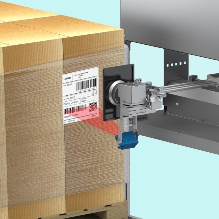 パレタイザー等でパレット上に荷物を積載し、自動ストレッチフィルム包装機等で包装したあとに、Videojet 9560PL を使用してラベルの印字・貼付ができます。1時間で最大 120 パレット分の荷物に貼付が可能です。