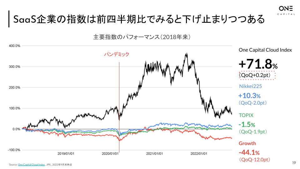 米金利上昇の影響を受け、SaaSをはじめとする成長企業の株価は大幅に下落しました。しかし前四半期と比較すると、グロース指数は12pt下落しているのに対し、SaaS上場企業29社で構成される「One Capital Cloud Index」は下げ止まりつつあることがわかります(前四半期比0.2pt増)。