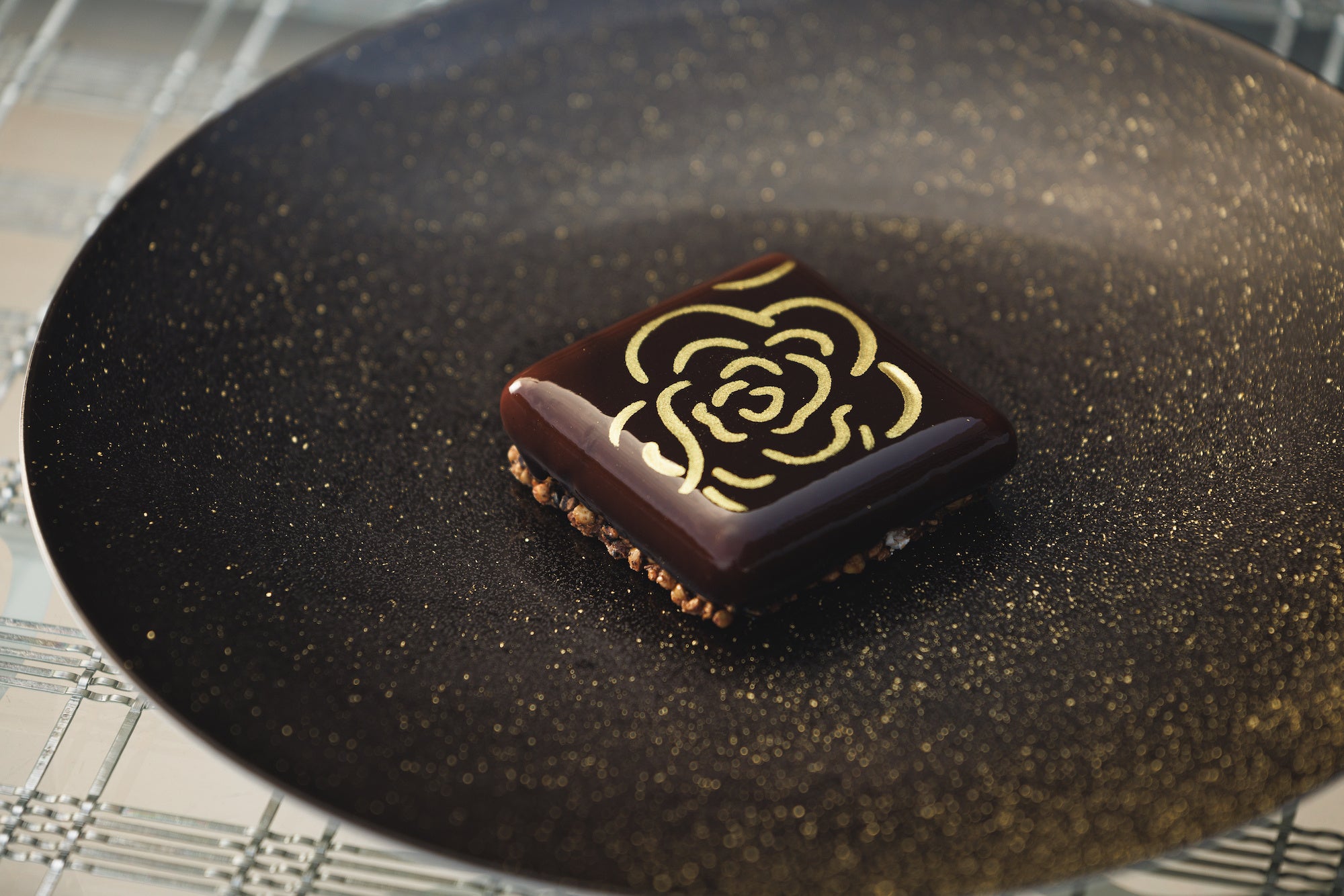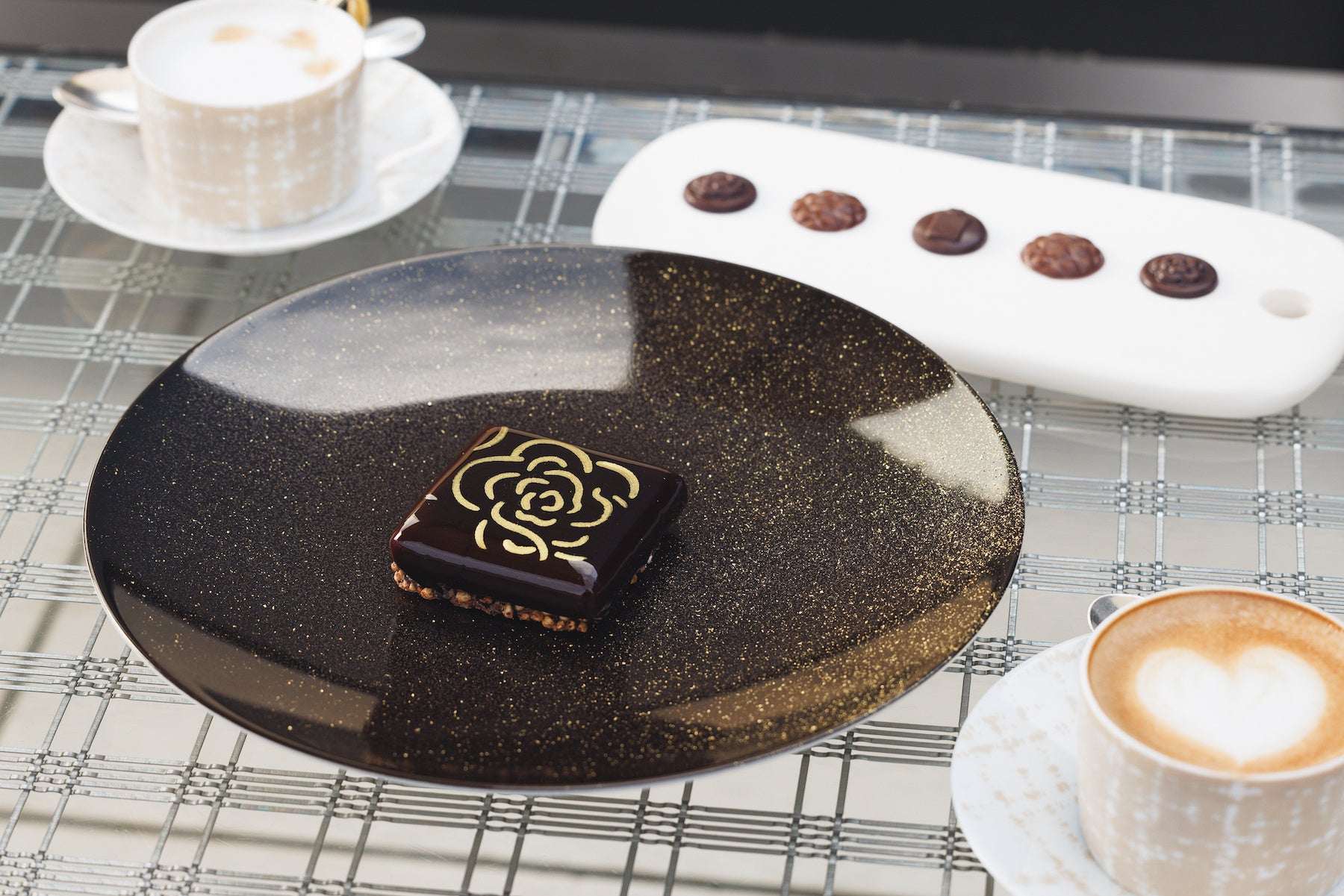 「ベージュ アラン・デュカス 東京」のシグネチャー「カレ・シャネル」とドリンクのセット。ゴールドのカメリアが描かれた真っ黒な正方形のショコラムースの中には、ショコラビスキュイ、塩キャラメル、プラリネクリーム、ショコラガナッシュやカカオニブと蕎麦の実を使ったフィアンティーヌなどが層となり、食べ進めるごとに様々な食感や味わいを堪能できます。