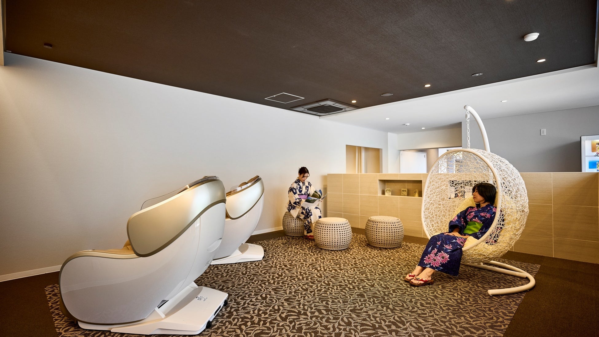 アンドリゾート株式会社の理念、キーワードである「癒し」。日々の喧騒から離れ、心を解き放してのリトリートに特別な空間を提供できるよう、湯上り処には2台のマッサージチェア、まるで宙に浮いているかのような不思議な感覚を得ることができるハンギングチェアを設置しました。