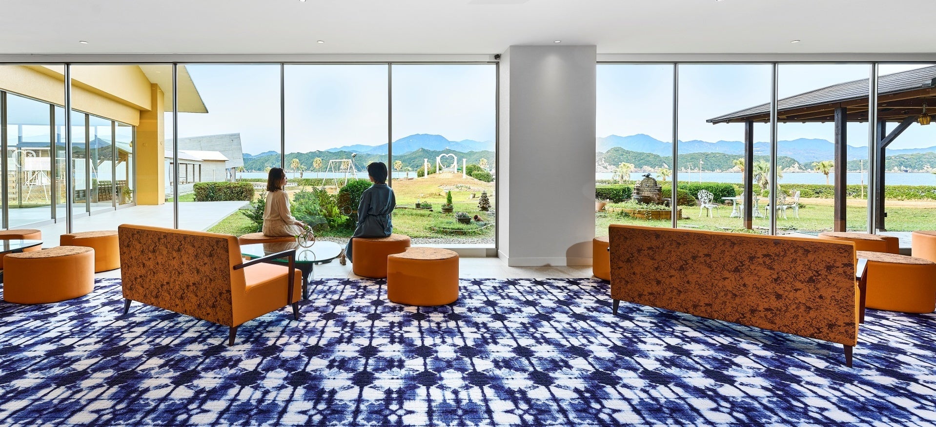 視界を遮るものを取り払ったエントランスからはガラス越しに美しい海景が垣間見え、館内に足を踏み入れる前からリゾート気分が高まります。ガラスフレームは幅の狭いものを採用し、景色を遮るものを極力減らすことで、当館の魅力である約4,500坪の広々としたガーデン、その奥に見える熊野の山々と豊かな海が、目の前に広がる壮大なパノラマを演出しています。また、建物の内側と外側に同じタイルを敷くことで内外の境界を感じることなく、より自然と一体感のある仕上がりとなっております。日ごとに青、紺碧、藍色と濃淡様々な表情を見せてくれる海をイメージした青基調のカーペットは、万物の源ともいわれる海に包まれているような癒しを与えてくれます。また、ソファーは和歌山の夕日をイメージしたオレンジ色を用いて、空間にアクセントをつけております。