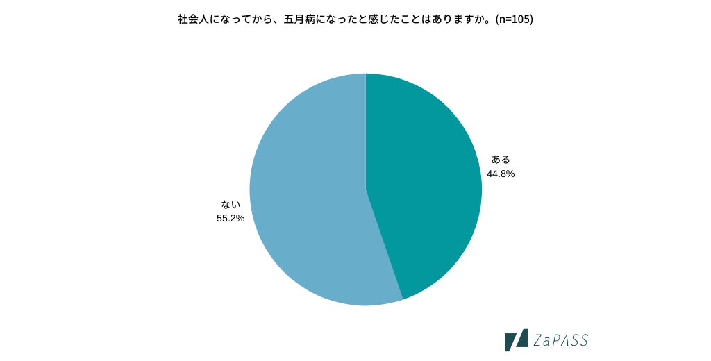 社会人になってから、五月病になったと感じたことがあるか尋ねたところ、「ある」が44.8%、「ない」が55.2%と、約5割が五月病の経験があることがわかりました。(n=105)