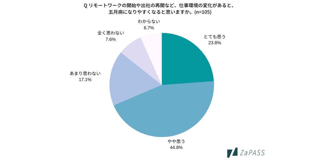 リモートワークの開始や出社の再開など、仕事環境の変化があると五月病になりやすくなると思うか尋ねたところ、「とても思う」と「やや思う」が合わせて68.4%と、約7割の方が仕事環境の変化で五月病になりやすいと考えていることがわかりました。(n=105)