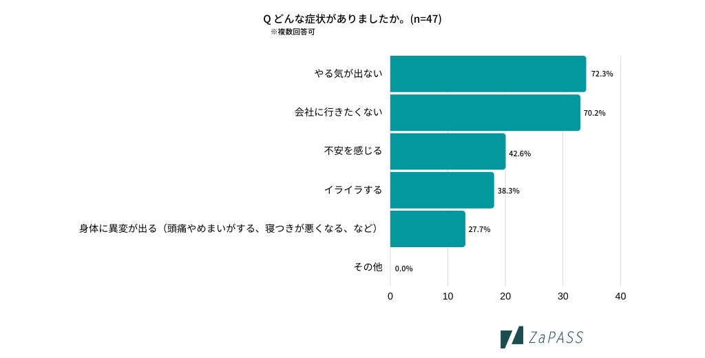 五月病の経験がある方にどんな症状があったか尋ねたところ、「やる気が出ない」が72.3%で最も多く、「会社に行きたくない」が70.2%、「不安を感じる」が42.6%と続きました。(n=47)