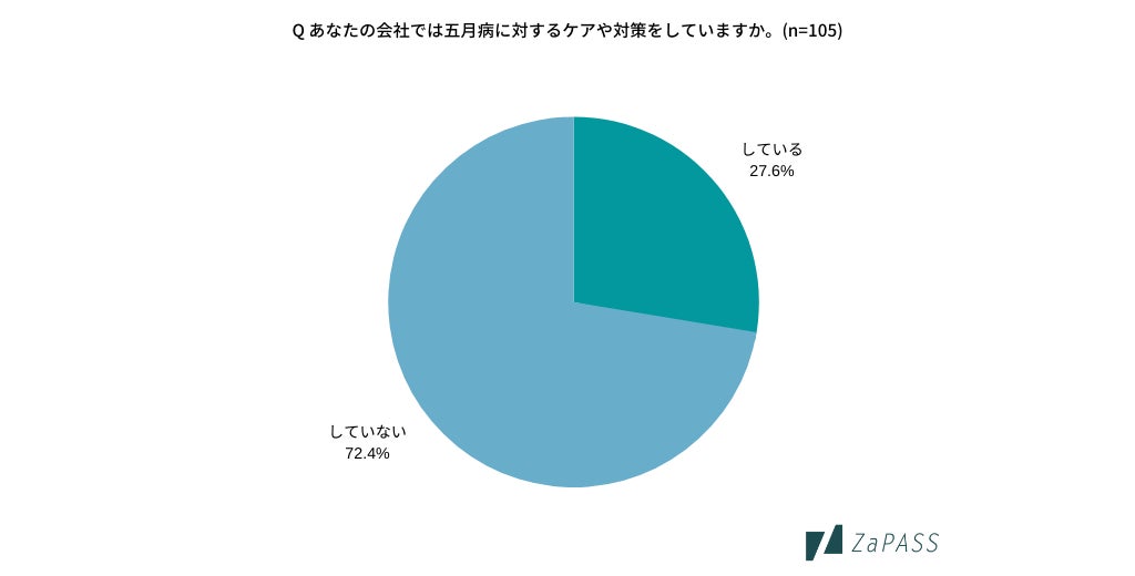 会社で五月病に対するケアや対策をしているか尋ねたところ、「している」が27.6%、「していない」が72.4%という結果になりました。ケア・対策の内容を尋ねたところ、「個人で実践できる五月病対策の周知」が51.7%で最も多く、「相談窓口の設置・周知」が44.8%、「メンタルヘルスに関するアセスメントの実施」が41.4%と続きました。(n=105)