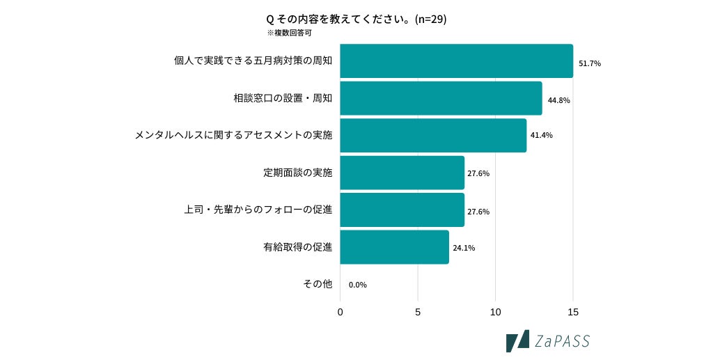 ビジネスパーソンの4割以上が五月病の経験がある一方で、ケアを行っている会社は3割以下と、五月病になる人が多いという状況に対して、対策が不足していることがわかりました。ケアを行っている会社で最も多かった対策法は「個人で実践できる五月病対策の周知」ですが、自身で五月病にならないために実施していることとして「特になし」という回答も多く、五月病対策がうまく機能していないケースもあるようです。