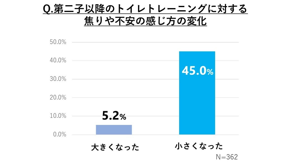 第二子以降の子供を持つ子育て当事者の内、約2人に1人(45.0%)が第二子以降の子供の方がトイレトレーニングに対する焦りや不安が小さくなったと回答。初めての子育てである第一子は、おむつはずれに対しての不安が大きくなっていることが考えられます。