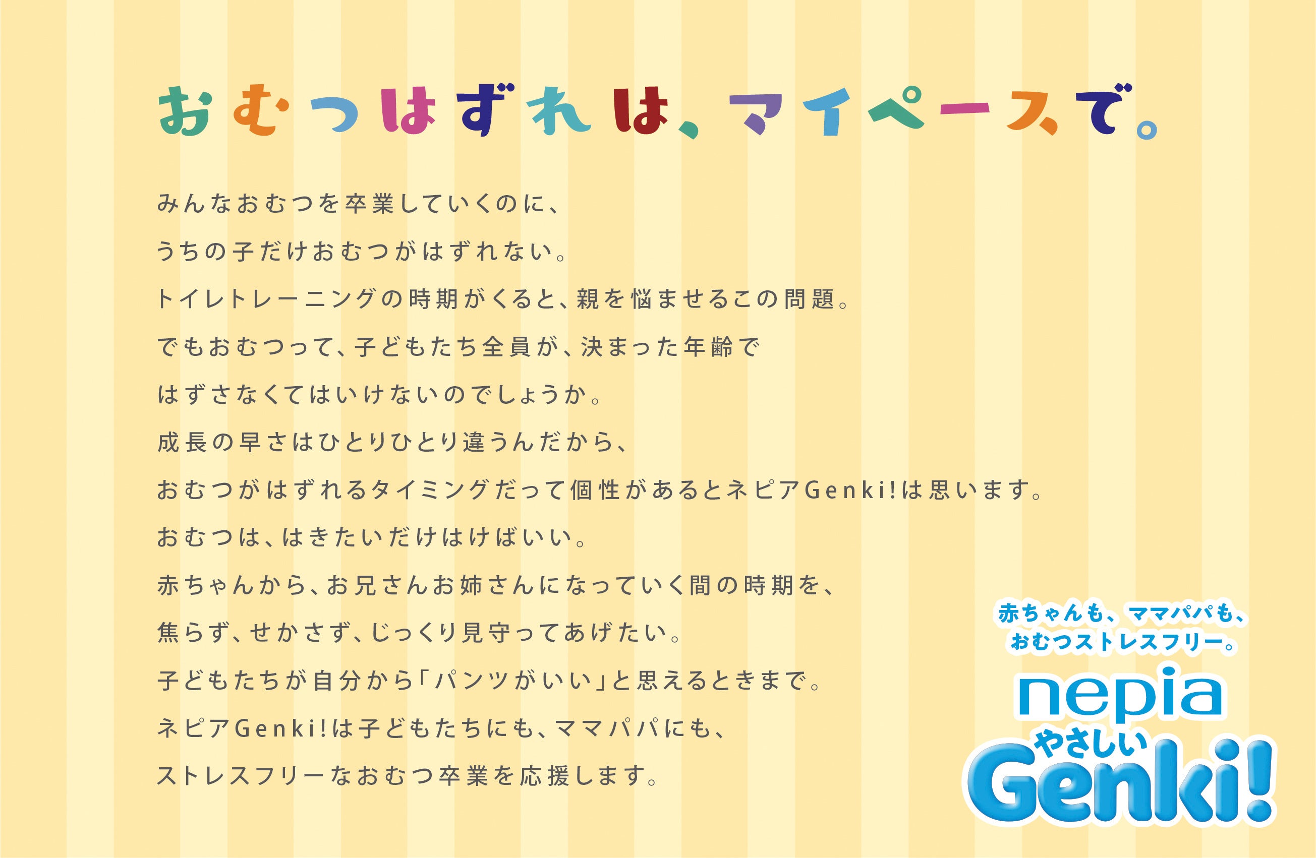 調査結果をもとに、“赤ちゃんも、ママパパも、おむつストレスフリー“をめざす「ネピア Genki!」は、おむつ卒業時期の多様化を尊重し、マイペースな”おむつはずれ“を応援する施策を展開します。