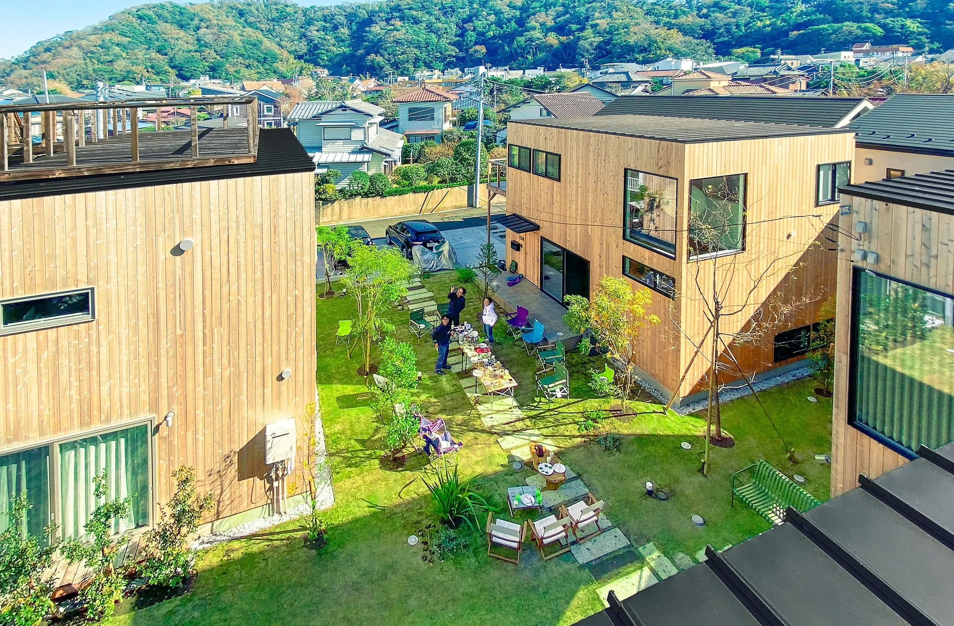 エンジョイワークスが2014年からプロデュースしている「エンジョイヴィレッジ」は、連続した敷地の一部をシェアして暮らす、ユニークな宅地分譲プロジェクトです。塀を作らず緑豊かな環境を共有し、ゆるやかに人と人をつないでコミュニティを醸成します。
